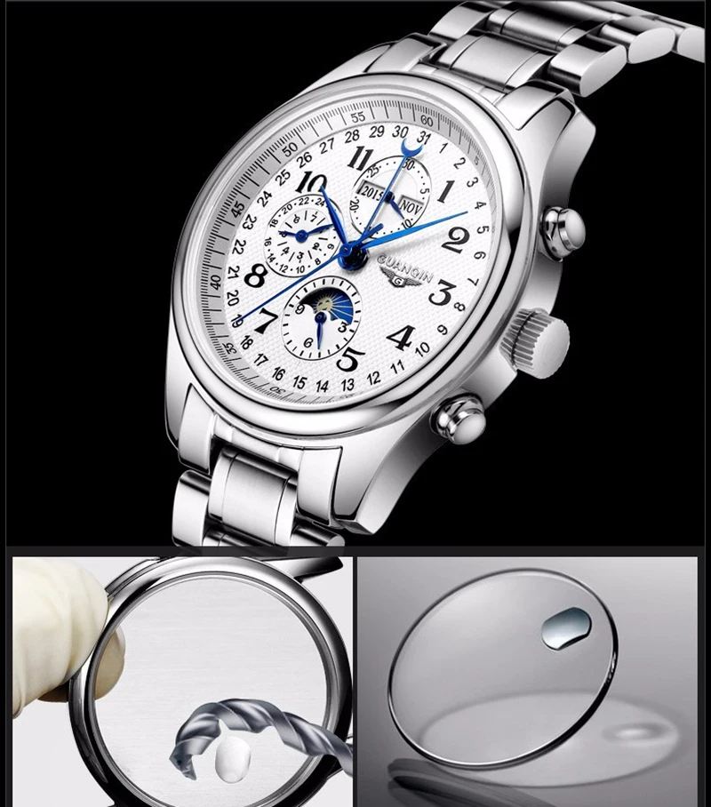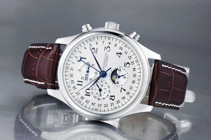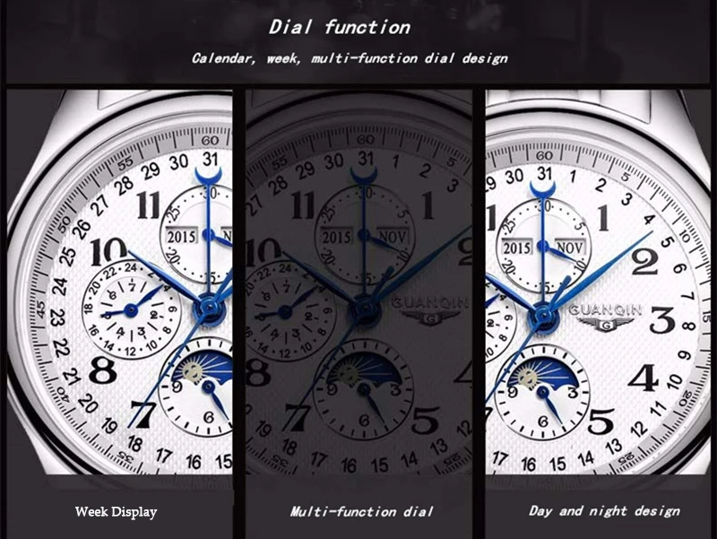 Добро пожаловать в часовой магазин GUANQIN. Меня зовут Ван Си Инь, главный менеджер GUANQIN. Для меня большая честь представить вам эти высококачественные часы-модель № GUANQIN 20022. Он оснащен высококачественным многофункциональным автоматическим механизмом, обновленным сапфировым стеклом (обновленное сапфировое стекло с 2 марта 2020 года), и оснащен дисплеем года, месяцем, отображением недели, отображение даты и фазы Луны, которые вы можете настроить, как вам нравится. Здесь вы можете посмотреть фотографии часов и просмотреть видео, чтобы узнать больше об этой модели. Мы надеемся, это поможет вам сделать правильный выбор. Хорошего дня.