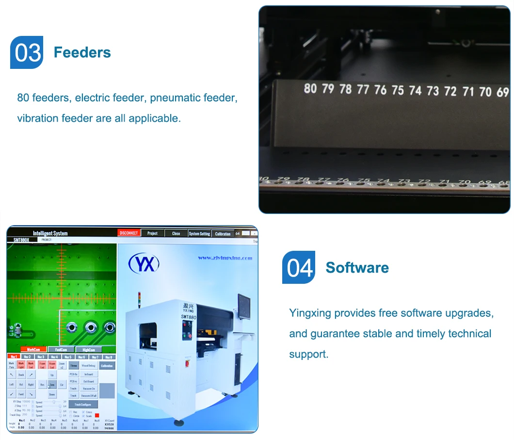 Машина SMT880 с 8 головками + 10 камерами + 80 ПИТАТЕЛЕЙ + трехступенчатая дорожка + Серводвигатель Panasonic + направляющая винта.