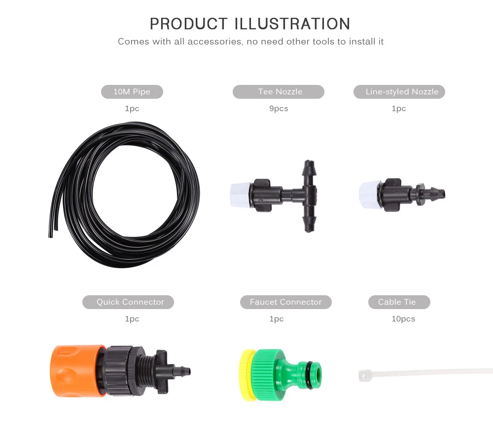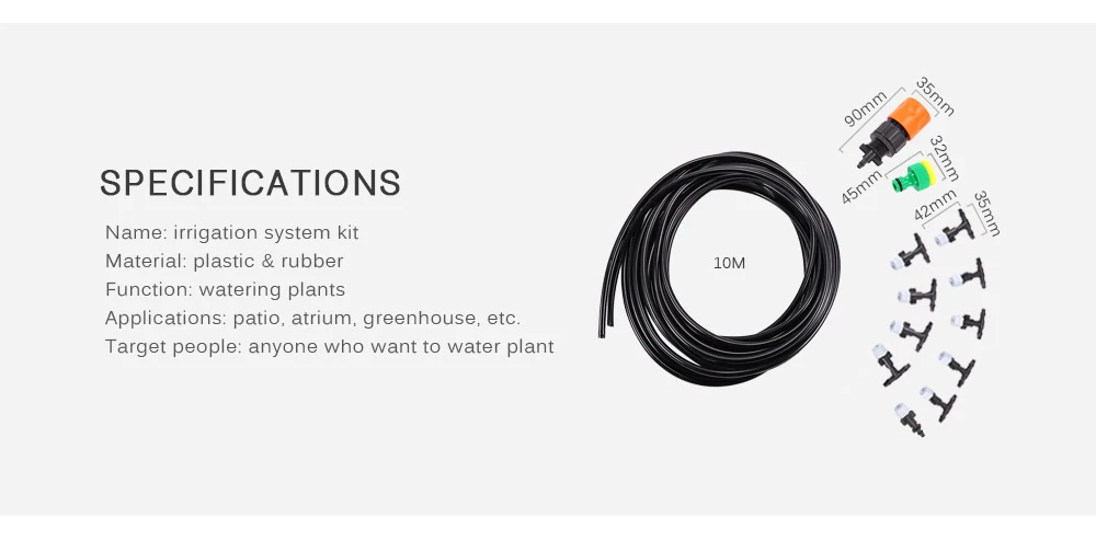 | Посылка содержание | 1 x шланг 10 м, 1 x быстрый разъем, 1 x шланг для душа, 1 x насадка с линейным дизайном, 9 x Тройник, 10 x кабельная стяжка |