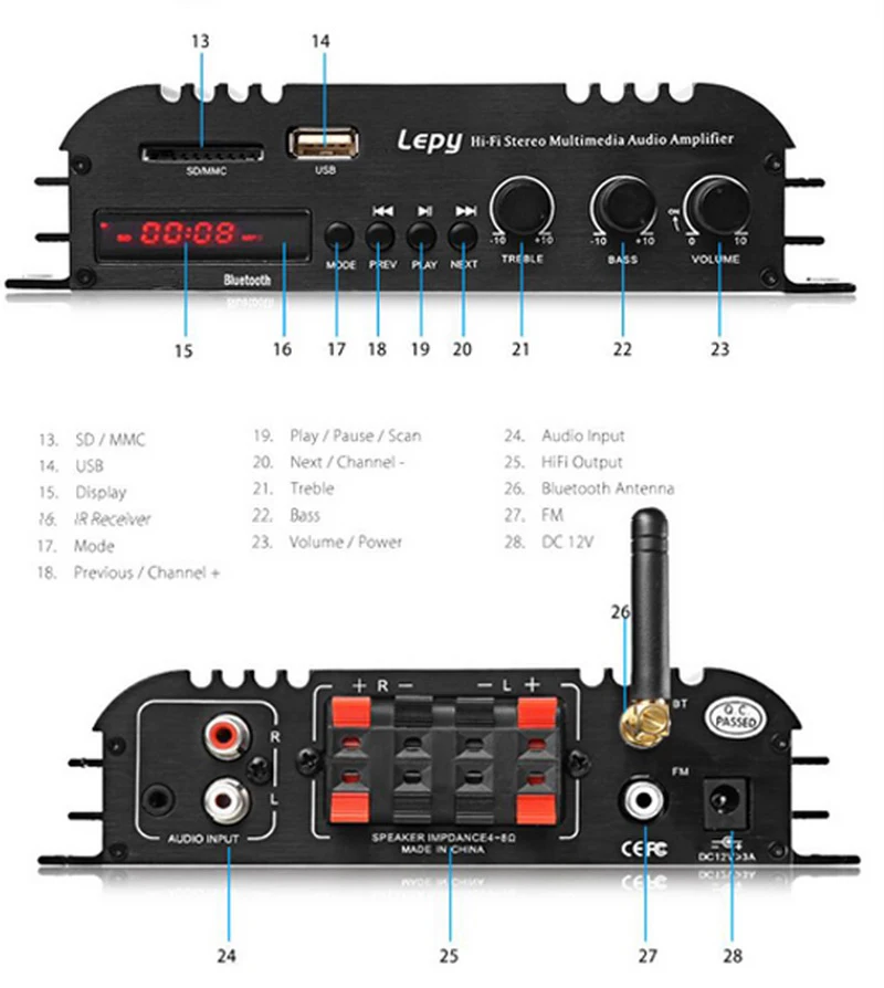 Не нужно покупать диск, если ваши любимые музыкальные файлы MP3 загружаются на телефон, u-диск, sd-карту, усилитель может читать музыкальные файлы MP3 напрямую. И светодиодный Яркий светящийся дисплей может показать статус воспроизведения, легко управлять музыкой в режиме реального времени