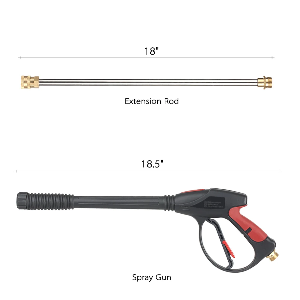 Этот пистолету мойки высокого давления комплект включает в себя 18,5 "пистолет-распылитель, 18" расширение стержня и 5 шт. быстрое соединение сопла советы. С помощью этого набора Вы можете повысить эффективность очистки для лучшей производительности и меньшего времени, потраченного на очистку. Пистолет имеет удобное сцепление, чтобы соответствовать вашим рукам, что делает вашу работу по стирке давления ветерком.