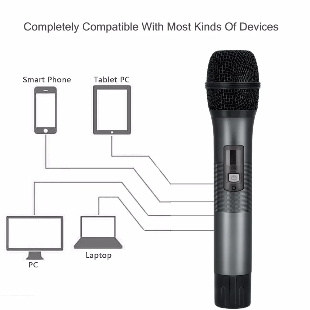 Параметры -Диапазон частот: UHF -Частота: 1 МГц -Каналы: двухканальный -Частотная характеристика микрофона: 50 Гц-18 кГц -Частота: ± 5 ч./мин -Прием/передача частоты управления: переменный канал, каждый микрофон поддерживает 25 каналов по выбору -SNR: >70 дБ -Искажения: ≤ 0.5% -Мощность передачи: >10 мВт -Пикап: подвижная катушка, ядро микрофона -Выходная Амплитуда: 500 мВ -Общий Частотный диапазон: 20 Гц-20 кГц -Чувствительность микрофона: -53 дБ -ЖК-дисплей микрофона: напряжение батареи, номер канала -Переносной микрофон источника питания: 3 в (2x1,5 V AA батареи) -Блок питания приемника: адаптер 5 В или внешний аккумулятор -Вход: сигнальная линия 3,5 мм -Выходной порт: разъем для наушников d3,5 мм Содержимое упаковки Ручной микрофон * 2 Приёмник * 1 Аудиокабель d3,5 мм * 2 D3,5 мм аудио-RCA кабель * 1 USB штекер в постоянный ток, шнур питания * 1 Противоскользящее кольцо * 2 Руководство пользователя * 1 |