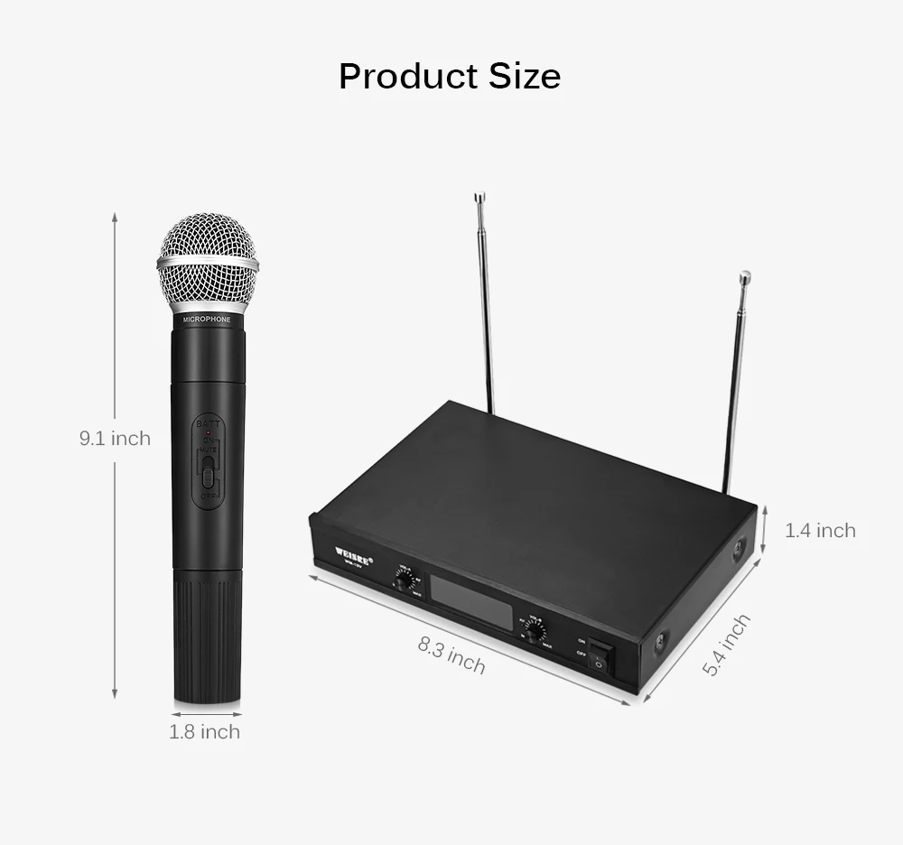 | Посылка содержание | 1 х ручной микрофон, 1 х микрофон на голову, 1 х приемник, 1 х батарейный блок, 1 х аудио кабель, 1 х вилка ЕС, 1 х Руководство по эксплуатации на английском языке |