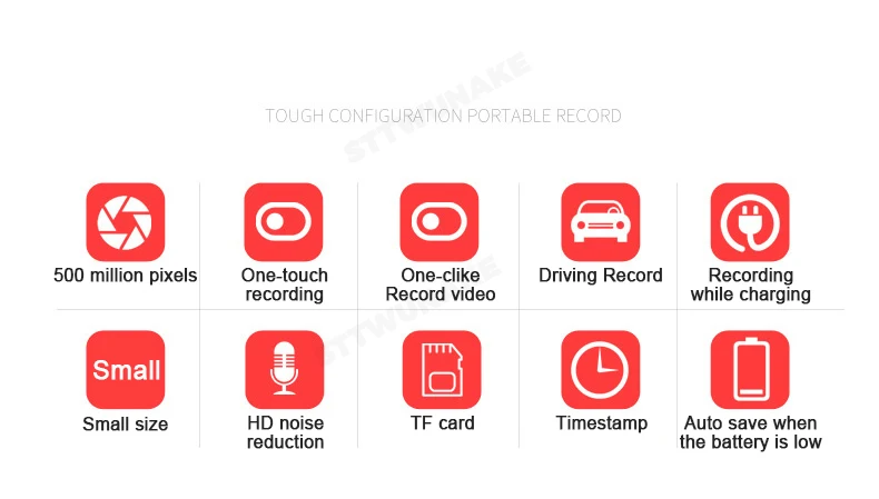 500 миллионов пикселей Запись одним касанием Запись видео в одном стиле Запись вождения Запись во время зарядки Маленький размер Шумоподавление HD TF карта Метка времени Автоматическое сохранение при низком заряде батареи
