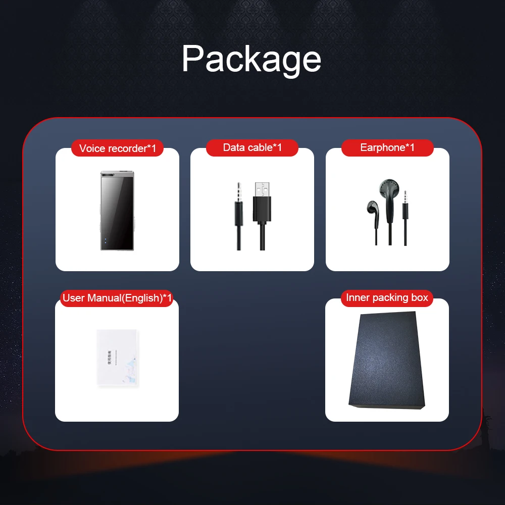 Голосовая запись * 1 Наушники * 1 Кабель для передачи данных * 1 Руководство пользователя (на английском языке) * 1 Внутренняя упаковочная коробка * 1