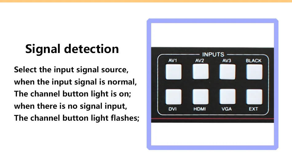 Полное выходное разрешение-светодиодный видеопроцессор предназначен для пользователей с удобным выходным разрешением, максимально широким достижением 2560 точек, самым высоким из 1536 точек, для различных матричных дисплеев. До 20 видов разрешения выхода для пользователей на выбор, и может быть отрегулирован на точечный выход. Технология предварительного переключения-технология предварительного переключения, переключение входного сигнала переключается для предсказания заранее ли входной сигнал канала. Эта функция уменьшает отключение линии или может быть из-за того, что чехол без входного сигнала для переключения непосредственно приводит к ошибкам, улучшает показатели успеха. Обнаружение сигнала-светодиодный видеопроцессор автоматически определяет, есть ли вход сигнала или нет, когда соответствующие входы подключены, Если текущий канал имеет входной сигнал, светодиодный индикатор канала сигнала, как правило, включен, и ЖК-экран покажет Тип источника сигнала и разрешение; Если текущий канал не имеет сигнала или нестандартного сигнала, светодиодный индикатор канала сигнала будет мигать, ЖК-экран не показывает сигнала.