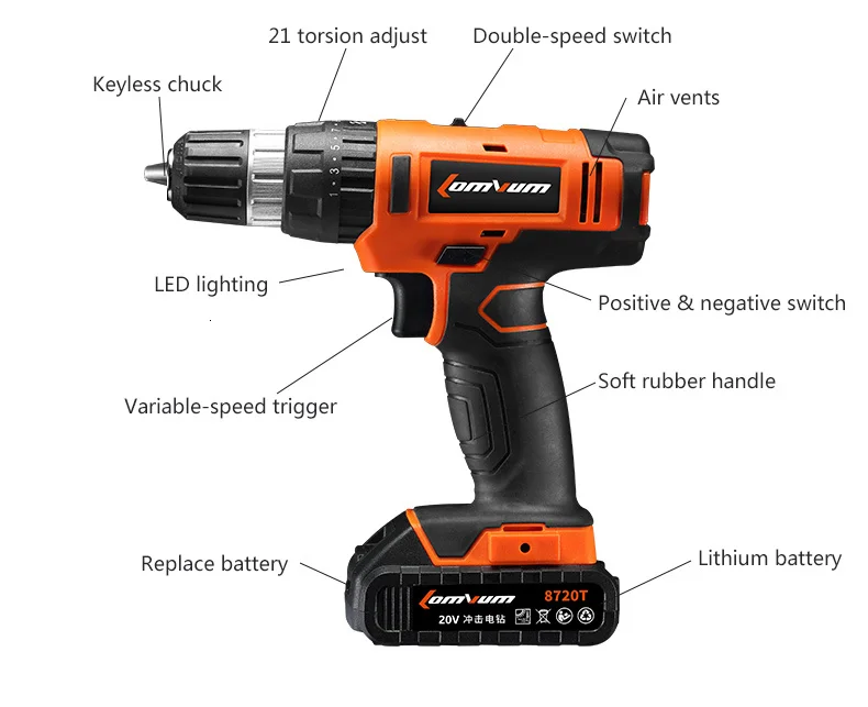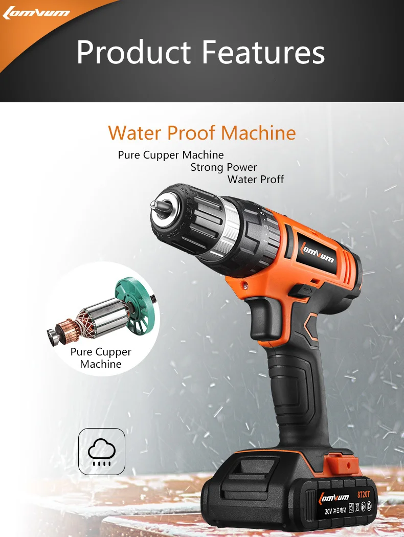 Набор для дрели LOMVUM 20 вольт упаковывает большой удар в небольшую упаковку, с мощным высокопроизводительным мотором, спрятанным внутри компактного дизайна, который улучшает удобство пользователя, особенно при работе в узких помещениях в течение длительного времени работы.