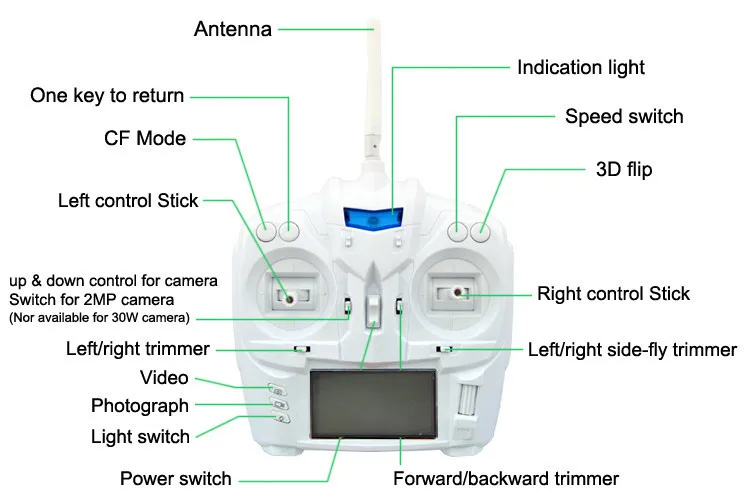 Описание: Наименование товара: K60 X-Fighter 2.4 г 6-Axis 4ch 2mp камера RC Квадрокоптер RTF Позиция no. : KAI Дэн KD K60 Цвет: черный, белый Частота: 2.4 г Канал: 4CH Расстояние управления: 300 м Время игры: 8 минут Время зарядки: около 90 мин Аккумулятор: 3.7 В 700 мАч Li-on Батарея для передатчика: 4 х АА батареи (в комплект не входят) Размер игрушки: 37x37x9 см Особенности: -С функцией headless mode. -Один ключ возврат. -С 2МП камерой можно снимать видео и картинку. встроенный Профессиональный ЭКУ Gimbal, можно использовать пульт ДУ для управления углами камеры (0-90), плавная регулировка, оформление просмотра безлимитным. -Двойной режим управления (режим начального уровня и профессиональный режим). -Продукт оснащен новым ЖК-монитором, он может отображать емкость батареи, прочность передаваемого сигнала, самолет \ передач скорости, дроссельной заслонки, вперед и назад, летящая сторона и т. д. -Ось 6-осевой системы позволяет Квадро, чтобы быть запущенной рукой. -6-оси GYRO Quad-rotorcraft полет, сильная стабильность, может легко осуществлять различные движения полета, более сильное сопротивление ветра, легче контролировать. -2.4 технологии, принятые для anti-interference.even более одного квадрокоптера, летят в то же время они не будут мешать друг с другом. -Квадрокоптер может летать как в помещении, так и на открытом воздухе. в том числе 4ch цифровая пропорциональная система RC. Функция: видео/фотография/Raise &; down/left/Lead/Left &; право поворота/левый и; правый летящий/360 градусов вращающийся Вышивка Крестом Пакет включают: 1 х самолет с камерой(Отправка без цветной коробки) 1 X ЖК-дисплей контроллер 1 X Отвёртки 4 х Крышка 1X2 г карты