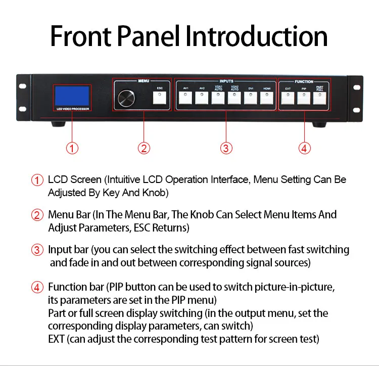 Более видео вход-светодиодный видеопроцессор 6-канальный видео вход, 2 CVBS, 2 VGA, 1DVI, 1 HDMI, в основном охватывает гражданских и промышленных целей. Переключение всех видео входов позволяет быстро резать и выцветать переходы.