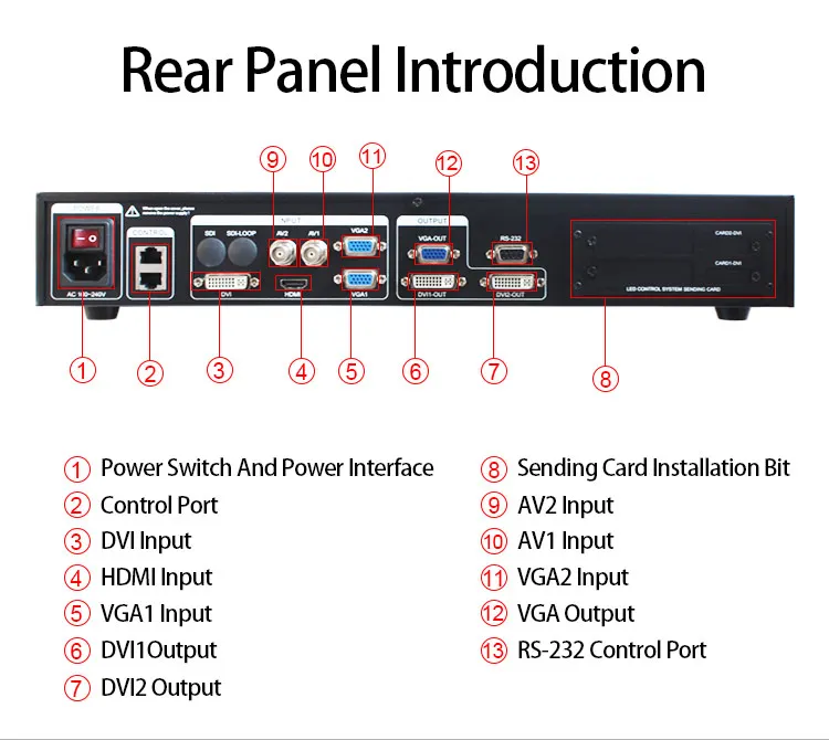 Практичные интерфейсы видеовыхода-светодиодный видеопроцессор имеет три видеовыхода. 2 видеовыхода с использованием двух выходов DVI, включая выход VGA и выходы DVI, имеют один выходной разъем. После того, как эти три видео запрограммированы, чтобы отправить выход на светодиодный-карту или монитор. В многомашинном соединении очень практично, устраняя использование видео-дистрибьютора, экономя пользователю утомительные соединения, уменьшая скорость сбоя подключения.