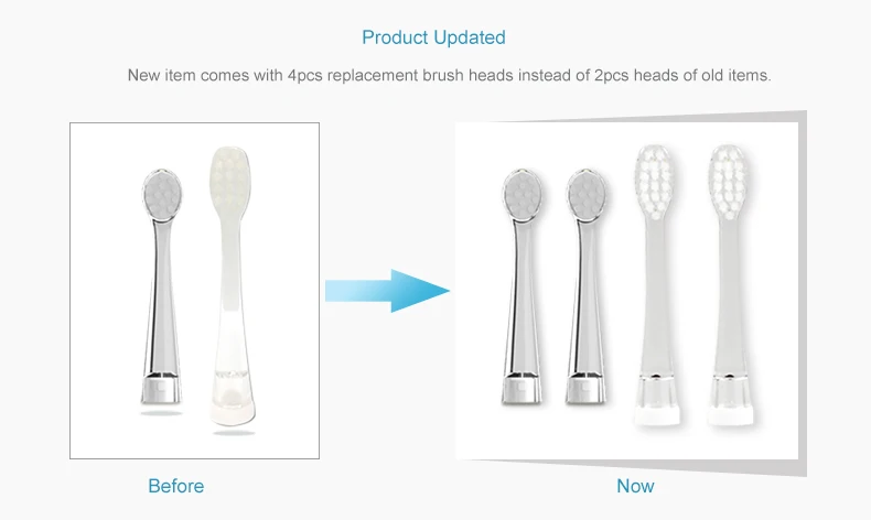 Новый товар поставляется с 4 сменными щеточными головками вместо 2 головок старых предметов.
