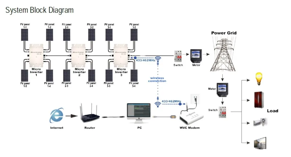 WVC-1200 (беспроводной) с использованием водонепроницаемого обтекаемого дизайна IP65, может эффективно предотвратить эрозию дождевой воды на поверхности, встроенная высокопроизводительная функция отслеживания максимальной мощности (MPPT), лучше отслеживать изменения солнечной яркости и контролировать различную выходную мощность, эффективно улавливать и собирать солнечный свет. Передача электрической энергии переменного тока с использованием технологии обратной передачи, является одной из наших запатентованных технологий, выходная мощность инвертора может обеспечить приоритетное использование нагрузки, дополнительное электричество в сетку, эффективное использование инвертора к излучаемой мощности, скорость передачи электроэнергии до 99%.