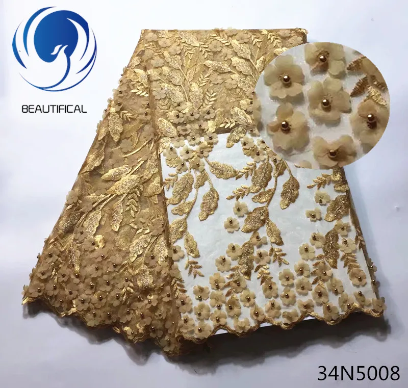 Beautifical Gold 3d lace fabric for wedding dresses latest 3d lace fabric with flower african beaded lace fabric 5 yards 34N50