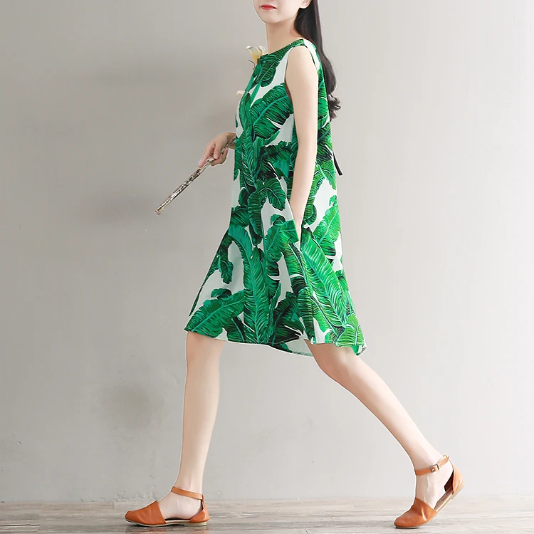 2018 высококачественное женское модное хлопковое платье без рукавов с принтом зеленых листьев