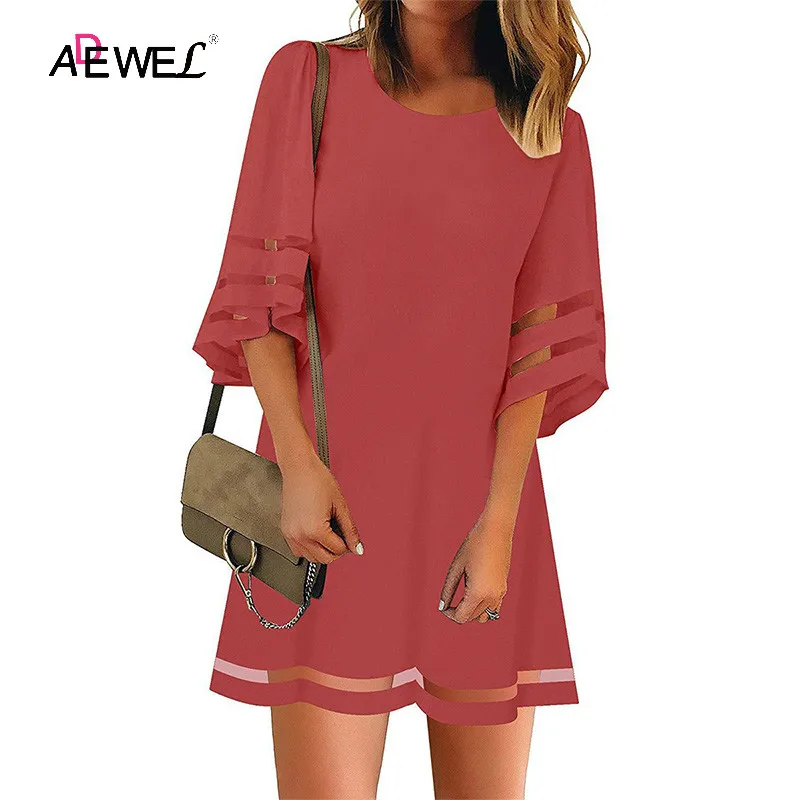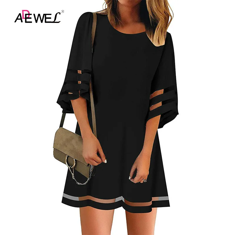 ADEWEL/летнее женское платье; Новинка 2021 года; Повседневное свободное платье трапециевидной формы; Сетчатое лоскутное платье с расклешенными рукавами; Женские пляжные платья; Платье с круглым вырезом