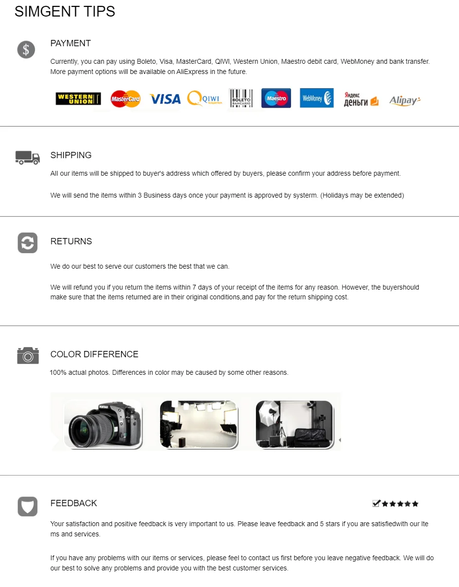 Мы гарантируем, что реальный размер совпадает с таблицей размеров. Возможна разница в 1-3 см в соответствии с измерениями вручную. Пожалуйста, внимательно проверьте таблицу размеров перед покупкой товара. Мы обещаем 100% изображение реальной продукции. Из-за различных мониторов отображение отличается, действительно делает тонкие цветовые карты и реальная ошибка является нормальной. О нас Все клиенты-наши друзья. Мы настаиваем на предоставлении нашим клиентам высокоэкономически эффективных продуктов. Нам нравится модный и уникальный продукт. Так что, Мы тщательно подобрали для вас уникальный продукт. Надеюсь, вам понравится. Если вам нужно большое количество товаров, Пожалуйста, свяжитесь с нами, Мы тщательно проверим окончательную цену и детали для вас сразу, Ваша поддержка-наше самое большое счастье. Доставка, возврат и отзывы 1. Мы обычно отправляем заказы в течение 2-5 дней после подтверждения оплаты в течение 24 часов. 2. Мы отправляем заказы Aliexpress стандартной доставкой, если вам нужен другой более быстрый способ, пожалуйста, сообщите нам перед покупкой. 3. Мы принимаем возврат в оригинальной посылка в течение 7 дней после прибытия. 4. Мы будем нести ответственность за возврат почтовых расходов, если что-то не так с товаром или листингом. 5. Покупатель несет ответственность за все расходы по обратной доставке. 6. Пожалуйста, оставьте нам 5 идеальных звезд, если вы удовлетворены нашим обслуживанием. 7. Если вы не удовлетворены, сначала свяжитесь с нами, и мы решим проблемы, насколько мы можем сделать для вас. 8. Мы надеемся, что мы сможем сделать все возможное для вас, негативные отзывы и споры не приветствуются.