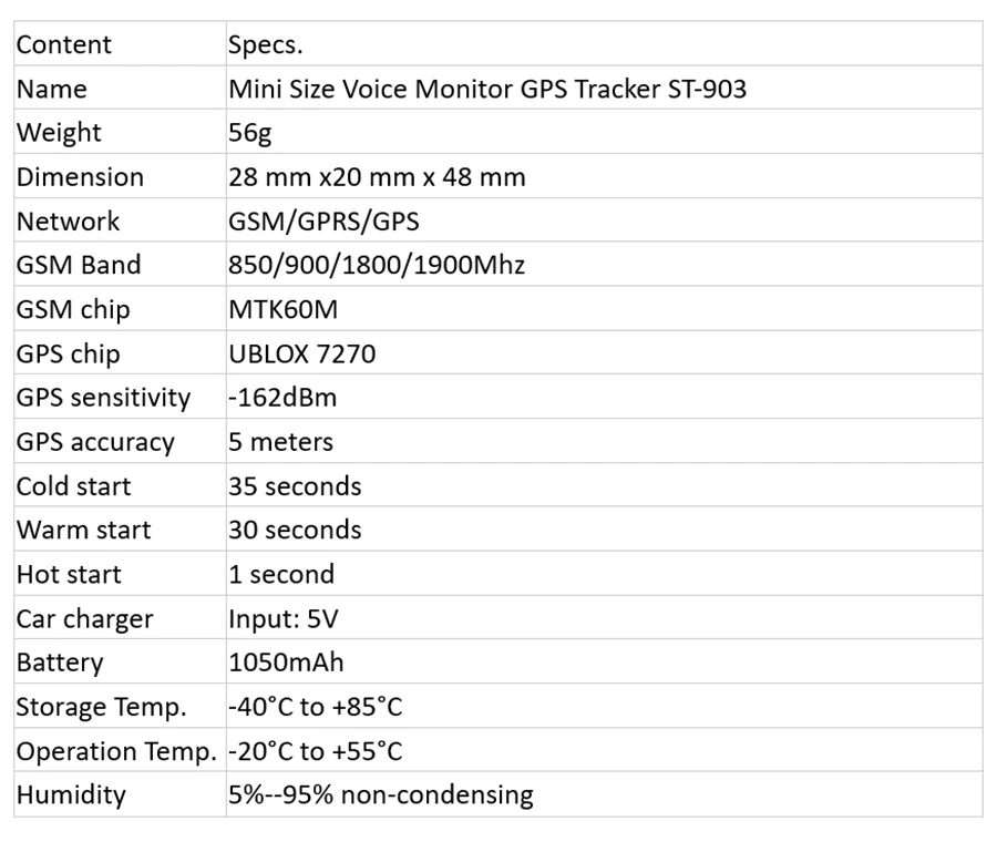 Режим ожидания, отключение GPS, GSM работает при низком потреблении. SMS, вызов может разбудить трекер до работы 5 минут.(ST-903 в режиме ожидания 5-7 дней)
