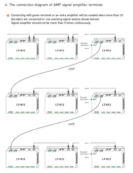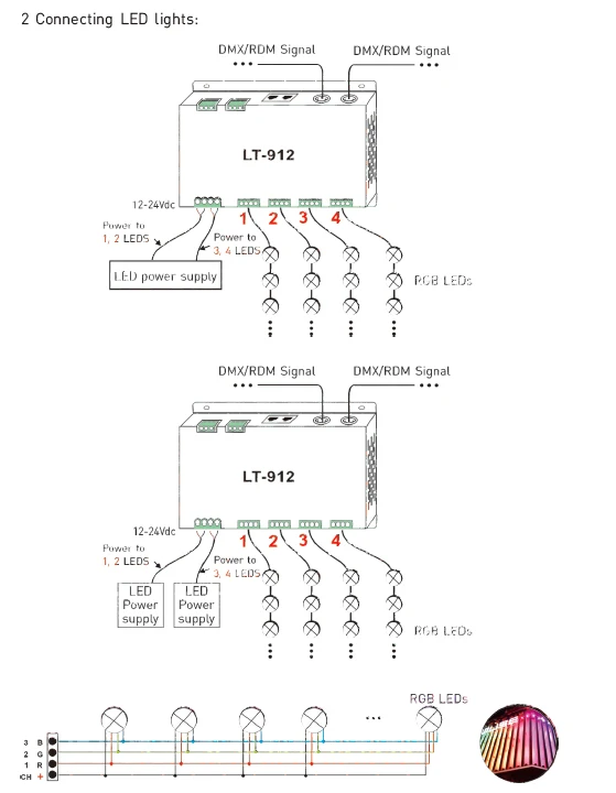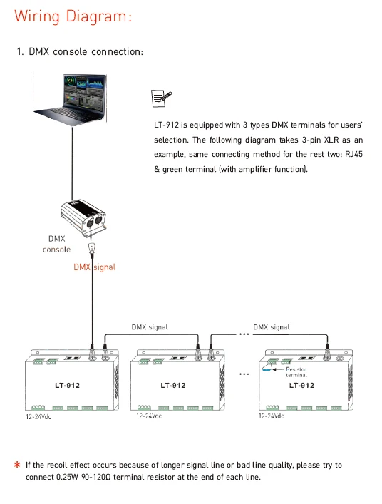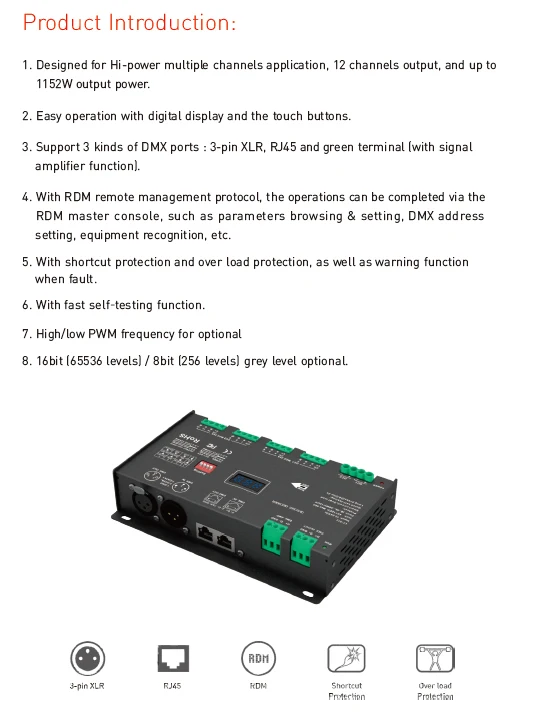 4. Поддержка 3 Виды портов DMX с функцией изоляции сигнала: 5-контактный разъем XLR Сделано в Китае, RJ45 и зеленый терминал (с функцией усилителя сигнала).