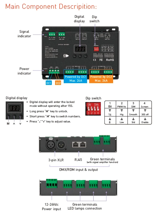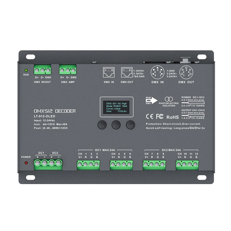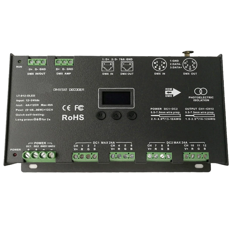 Новый светодиодный DMX декодер DC12V -24 В вход; 4A * 12CH 48A выход 1152 Вт RGB/RGBW Светодиодная лента 12 каналов DMX декодер XLR-3/RJ45 порт