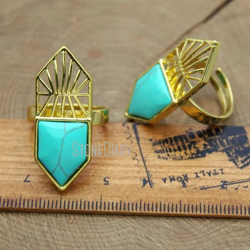 RM10111 модное кольцо с пятиугольником из бирюзы, Золотой Шестигранник, медное кольцо для регулировки