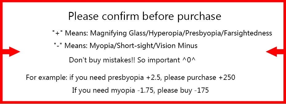 3.Эти очки могут иметьБлизорукости, около зрения, короткий взгляд, видения при температуре минус (-0,5 к-6,0). И вы можете заказать cutomize делают его для чтения, дальнозоркости, увеличительное зеркало, prisbyopia,Farsight (+ 0,5 до + 6,0), таким образом, не покупайте ошибки, спасибо.(Сообщение для продавца)