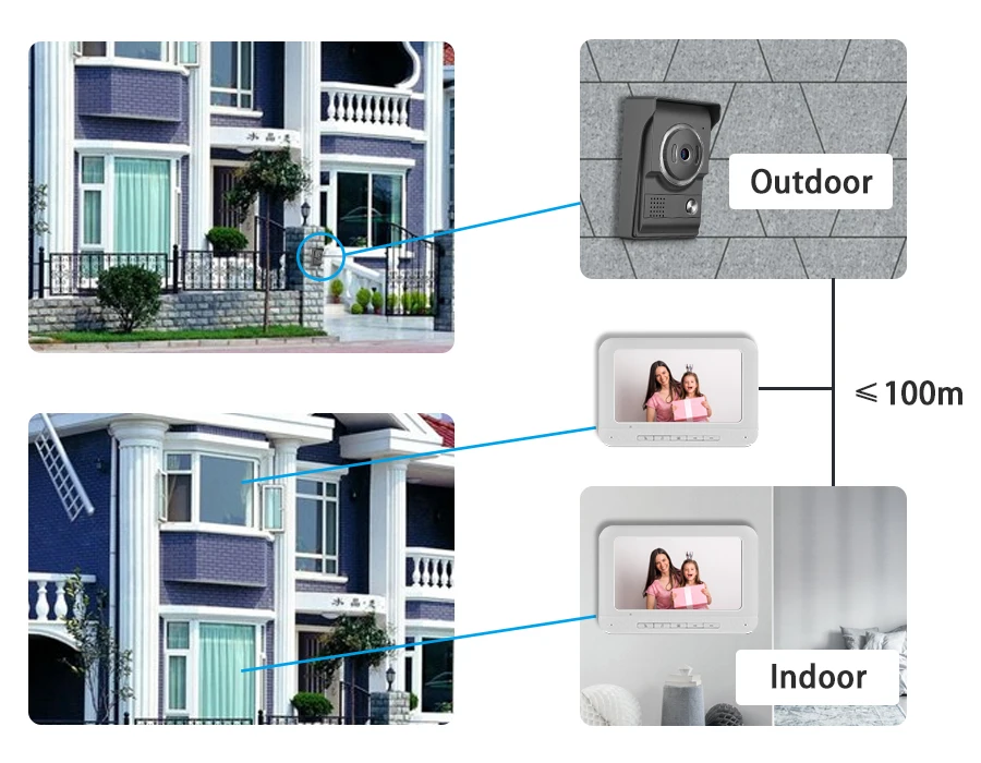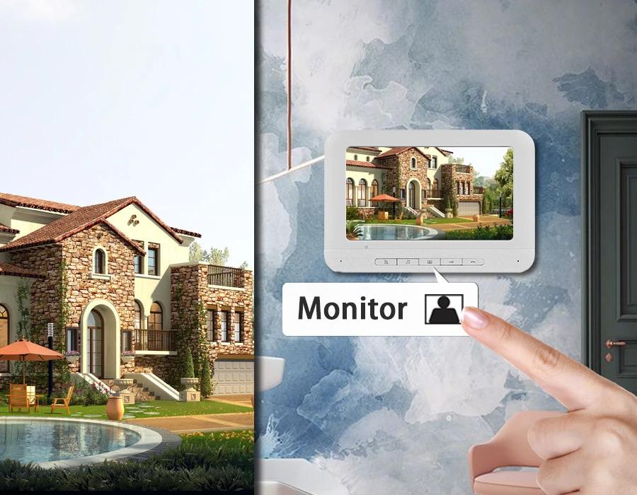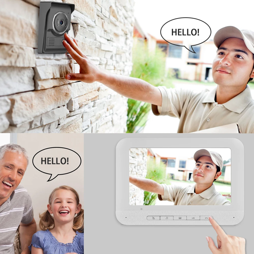 7 дюймов ЖК-дисплей для контроля уровня сахара в крови с ночное видение, в который входят одна 1000TVL наружная камера и один крытый монитор, который сочетает в себе функции визуальный домофон, наблюдения в режиме реального времени, пульт дистанционного управления, защита от дождя и ночное видение, который широко используется в виллах, квартирах, домах, гостиницах, офисах, общественных зданиях и тд.