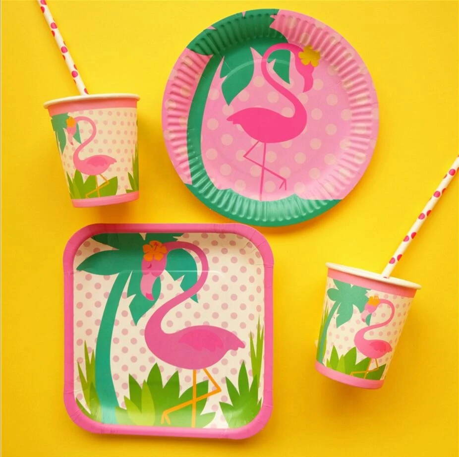 Одноразовые наборы посуды с фламинго, тарелка и чашка для вечеринки, товары для вечеринок, свадьбы, детский день рождения, декор для бассейна