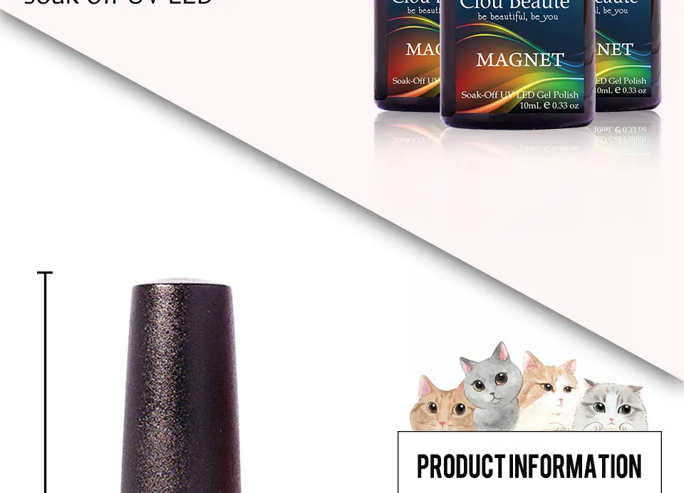 Шаг 1. Очистите ногти, затем обрежьте лицо как обычный процесс маникюра Шаг 2. Полностью встряхните лак, он может сделать цвет лака сбалансированным. Шаг 3. Сначала нанесите Базовое покрытие, что позволит лаку держаться дольше, затем сушить УФ-лампой в течение 2 минут или светодиодной лампой в течение 60 секунд. Шаг 4. Нанесите первый слой цветного лака непосредственно, вылечите УФ-лампой в течение 2 минут или вылечите светодиодной лампой в течение 60 секунд. Шаг 5. Нанесите второй слой цветного лака, не излечивайте и положите магнит на ногти на 10 секунд, чтобы получить эффект кошачьих глаз, И затем немедленно лечится УФ-лампой в течение 2 минут или излечивается светодиодной лампой в течение 60 секунд. Шаг 6. Нанесите смывающимся верхним слоем, что сделает цвет более блестящим, и сушить под светодиодной или УФ-лампой. Шаг 7. Снимите липкий слой при помощи пропитанного средством для снятия лака ватного диска.