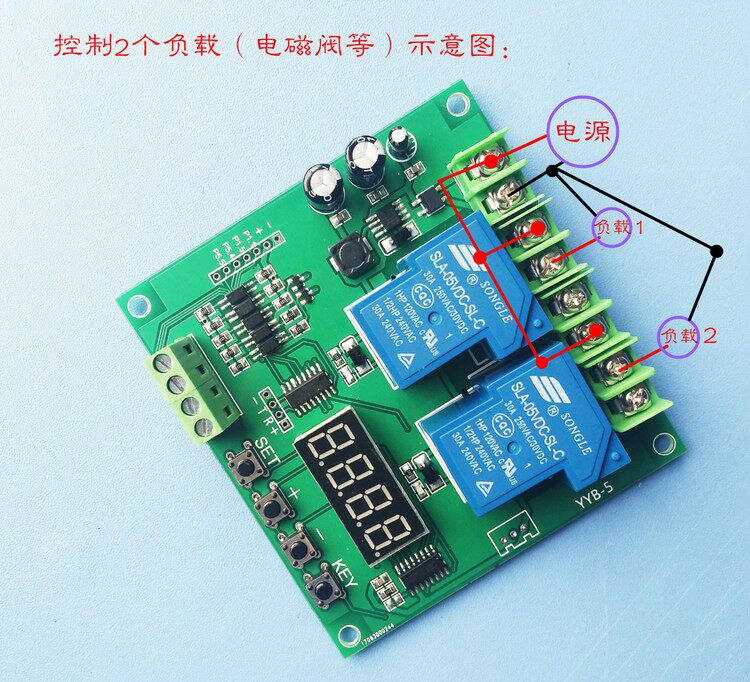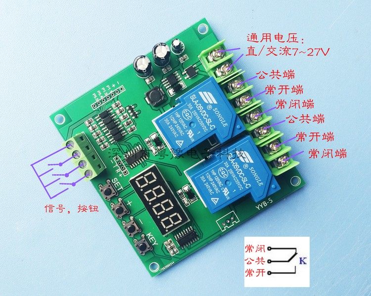 1: Модель продукта: YYB-5 6 общих функций, чтобы удовлетворить больше потребностей приложений; можно управлять 2 электромагнитными клапанами, насосами, моторчиками, огнями и другим свободным бегом.2: Входное напряжение: DC/AC 7 В ~ 27 В3: Выходная мощность: DC или AC нагрузка, которую можно контролировать в пределах 30А.4: временной диапазон: 0. До 999 минут, регулируется в любое время.5: Соединение порта подключения:1, AC/DC: Входная мощность DC/AC 7 В ~ 27 В2, в 1: вход сигнала терминала 1 (отрицательный триггер)3, IN2: входной сигнал сигнала 2 (отрицательный триггер)4, IN3: входной сигнал терминала 3 (отрицательный триггер)5, нет: реле часто открывает интерфейс, реле приостанавливает, прежде чем войти, И затем сокращает связь с COM.6, COM: общий интерфейс реле7, NC: реле обычно закрыто, реле коротковато до COM, прежде чем он будет втянут.6: функция Список: функция может быть куплена назад произвольно set, есть инструкции предоставлены; отключение питания можно установить на любые параметры памяти.P--1: дает сигнал 1, реле 1 тянет на время, автоматически останавливается; дает сигнал 2, реле 2 рисует время B для остановки автоматически; сигнал 3-аварийный сигнал аварийной остановки.P--2: сигнал 1, реле 1 всасывания на время автоматической остановки; реле 2 от сигнала запуска задержки B время после времени, чтобы впитаться в время C автоматической остановкой (Этот функциональный блок времени должен быть последовательным)После П-3: электризуется, реле 1 впитывается в время выпуска, ждет C временем, реле 2 поглощается в B время выпуска, ждет C временем; реле 1, 2 повернуть неопределенный цикл(Если Контроль двигателя является положительным и обратным, то можно понять, что: электромотор поворачивается на период времени; остановка на период времени; автоматическое смещение времени; остановка в течение периода времени; затем автоматически поворачивается; такой цикл)П-4: сигнал 1, реле 1 всасывания; сигнал 2 (предел), реле 1 остановка и время запуска до реле времени 2 поглощение; сигнал 3 (предел), реле 2 стоп и время запуска в B реле времени 1 поглощение; бесконечный цикл(Если Контроль двигателя является положительным и обратным, то можно понять, что: нажмите кнопку Пуск 1; мотор поворачивается к пределу 2, чтобы остановиться на период времени; автоматически возвращается к пределу 3 для остановки в течение периода времени; затем автоматически преобразуется; Такой цикл)P--5: сигнал 1, реле 1; сигнал 2 (предел), реле 1 остановка и время запуска до реле времени 2; сигнал 3 (предел), реле 2 остановки; снова отдайте сигнал 1; снова Выполните в очередной раз(Если Контроль двигателя является положительным и обратным, то можно понять, что: нажмите кнопку Пуск 1; двигатель идет к пределу 2, чтобы остановиться на период времени; автоматически возвращается к предельной 3 остановке; затем дает сигнал 1; в очередной раз)P-6: до сигнала 1, реле 1; сигнал 2 (предел), реле 1 стоп; сигнал 1, реле 2 поглощения; сигнал 3 (предел), реле 2 стоп;(Если Контроль двигателя является положительным и обратным, то можно понять, что: нажмите кнопку Пуск 1; перейдите к предельной 2 остановке; нажмите кнопку Пуск 1 снова; реверс до предела 3 остановки;)С функцией дистанционного управления: пульт дистанционного управления ключ и B key start в качестве верхней функции для сигнала 1 и сигнала 2; C клавишу C нажимает реле 1 (положительный поворот); затем реле 1 останавливает (останов