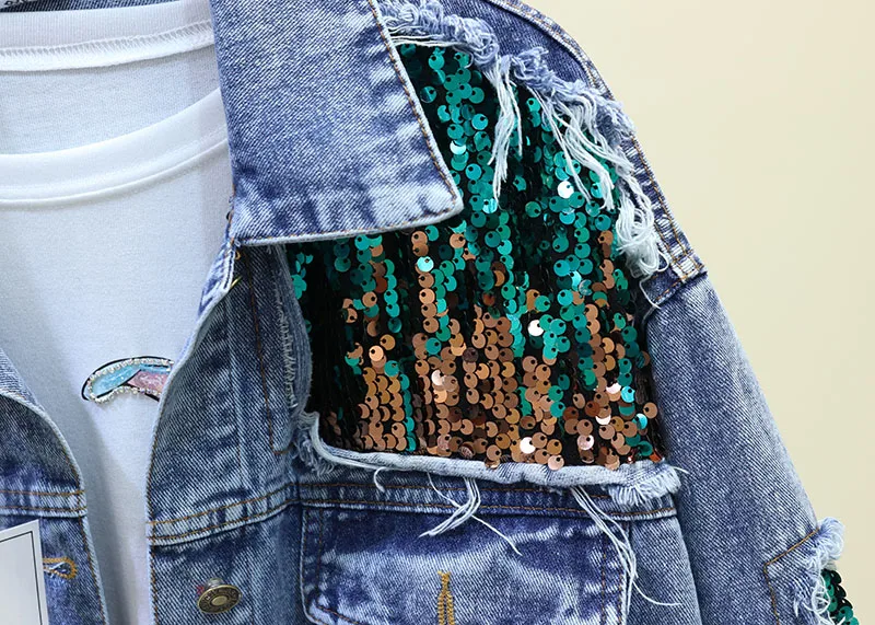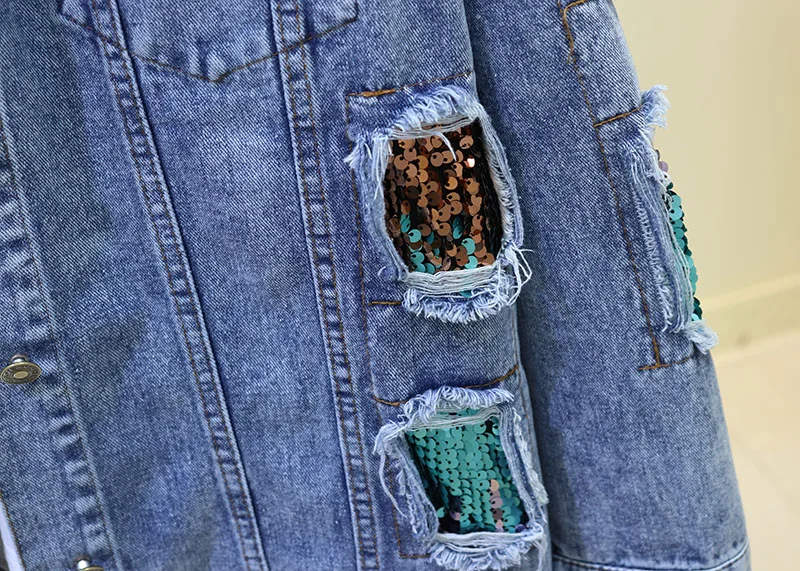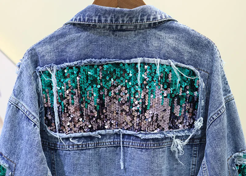 Harajuku Женская Повседневная джинсовая куртка с блестками, винтажная джинсовая куртка с длинными рукавами и дырками, свободная Лоскутная джинсовая куртка с блестками