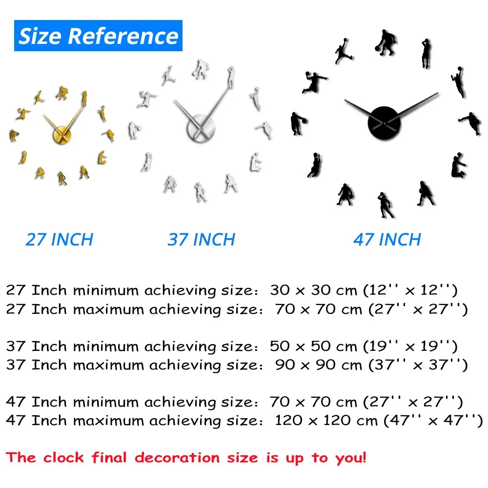 Размер отделки часов основан на ваших предпочтениях, чтобы украсить вашу стену. Часовая длина руки -27 дюймов: 13,5 см (5,3 '') -37 дюймов: 23,5 см (9,25 ") -47 дюймов сенсорный экран: 31,5 см (12,5 '') Минутная длина руки -27 дюймов: 19,5 см (7,6 '') -37 дюймов: 31,5 см (12,4 '') -47 дюймов сенсорный экран: 39 см (15,4 '') Минимальное достижение -27 дюймов: 30x30 см (12 ''x 12'') -37 дюймов: 50x50 см (19 ''x 19'') -47 дюймов: 70x70 см (27 ''x 27'') Максимальное достижение -27 дюймов: 70x70 см (27 ''x 27'') -37 дюймов: 90x90 см (37 ''x 37'') -47 дюймов: 120x120 см (47 ''x 47'')