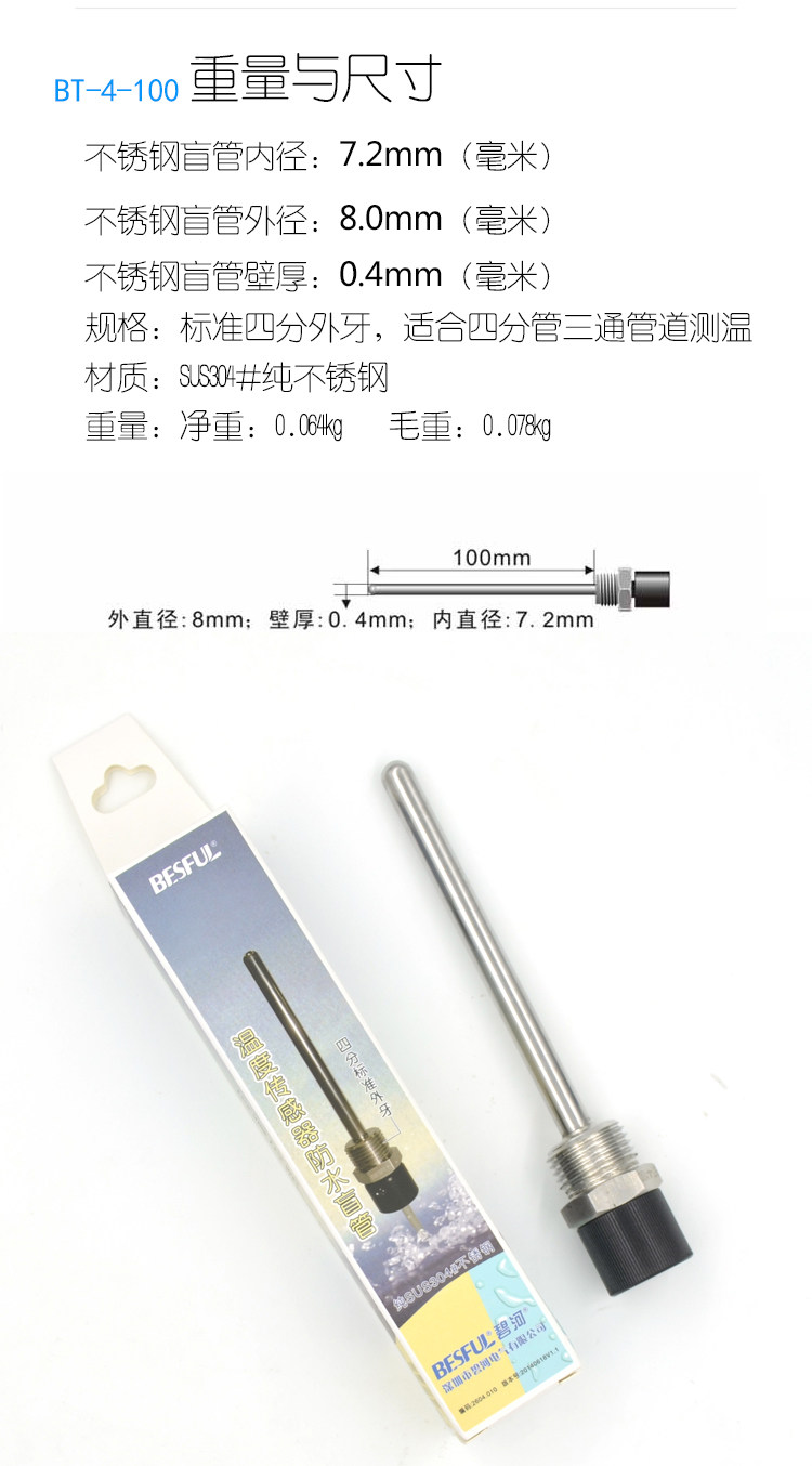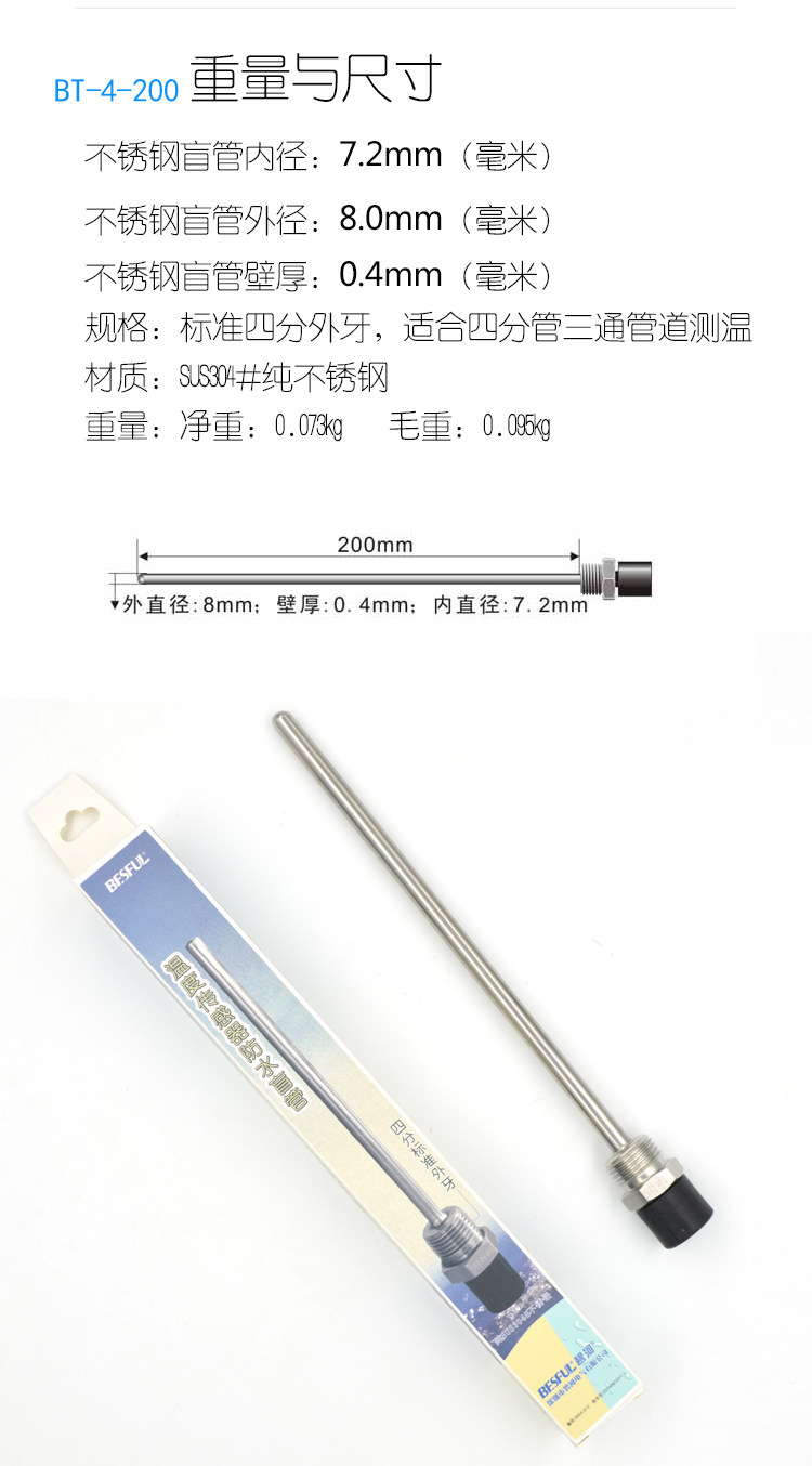 Bimo водостойкая глухая труба изготовлена из нержавеющей стали SUS304 # и датчик температуры вставляется в водонепроницаемую глухую трубу для измерения температуры воды, чтобы защитить датчик температуры от повреждения воды. Стандартный четырехточечный внешний дизайн зубьев подходит для четырех труб, которые подходят для измерения температуры резервуара для воды. 2,2 см обычно используется для измерения температуры труб в 4 точках 10 см/20 см, как правило, используется для измерения температуры резервуара для воды Установите схему схемы: