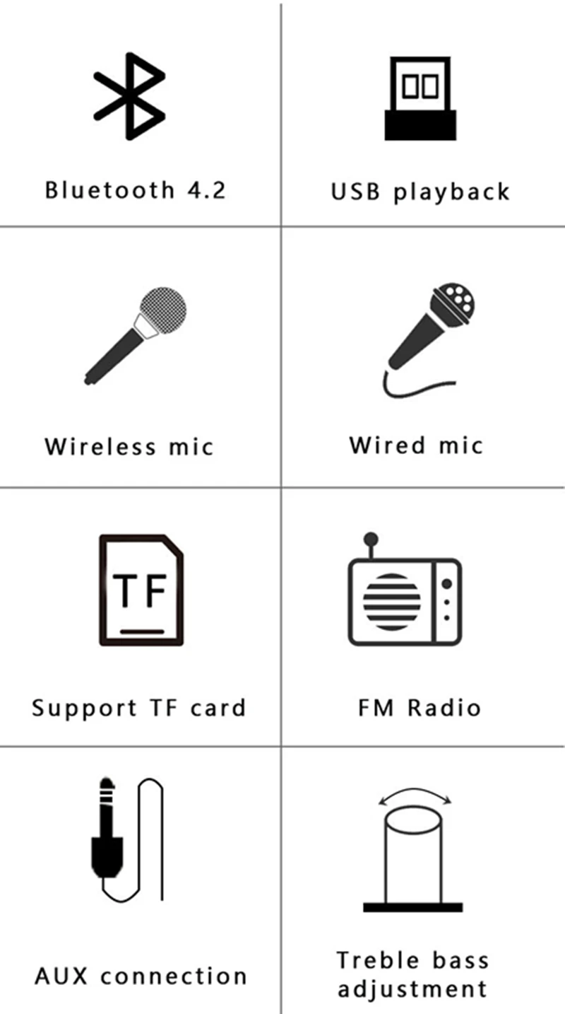 Цвет: черный, камуфляж, граффити Модель: CH-M18 Bluetooth: V4.2 Расстояние Bluetooth: 10 м Емкость аккумулятора: 1500 мАч Отношение сигнал-шум: ≥ 80dB Аудиовход: AUX, USB, tf-карта, Bluetooth Питание: USB зарядка Выходная мощность: 5 Вт Входное напряжение: 110 В ~ 220 В/50 Гц Размер: прибл. 37.4x15x1 5 см/14.72x5.91x5.91'' Объемный Звук 360 °, качество звука без шума. Поддержка вставки проводного микрофона, подключите микрофон в любое время для пения. Bluetooth 4,2, расстояние до 10 м, может быть подключено к мобильным телефонам, планшету, компьютеру или ноутбуку. Встроенная функция fm-радио, прослушивание популярного музыкального радио, простота в эксплуатации. Емкость аккумулятора, 1500 мА · ч, 4 часа любви к непрерывному воспроизведению, выносливость и прочность. Как использовать: 1. Подключите, поверните кнопку громкости по часовой стрелке и начните. 2. Откройте Bluetooth сотовый телефон, устройство CH-m18'', Bluetooth Подключено. 3. Если вы хотите Переключить другие функции, такие как fm-радио, пожалуйста, нажмите кнопку «режим», функциональный переключатель, дисплей будет иметь подсказку.