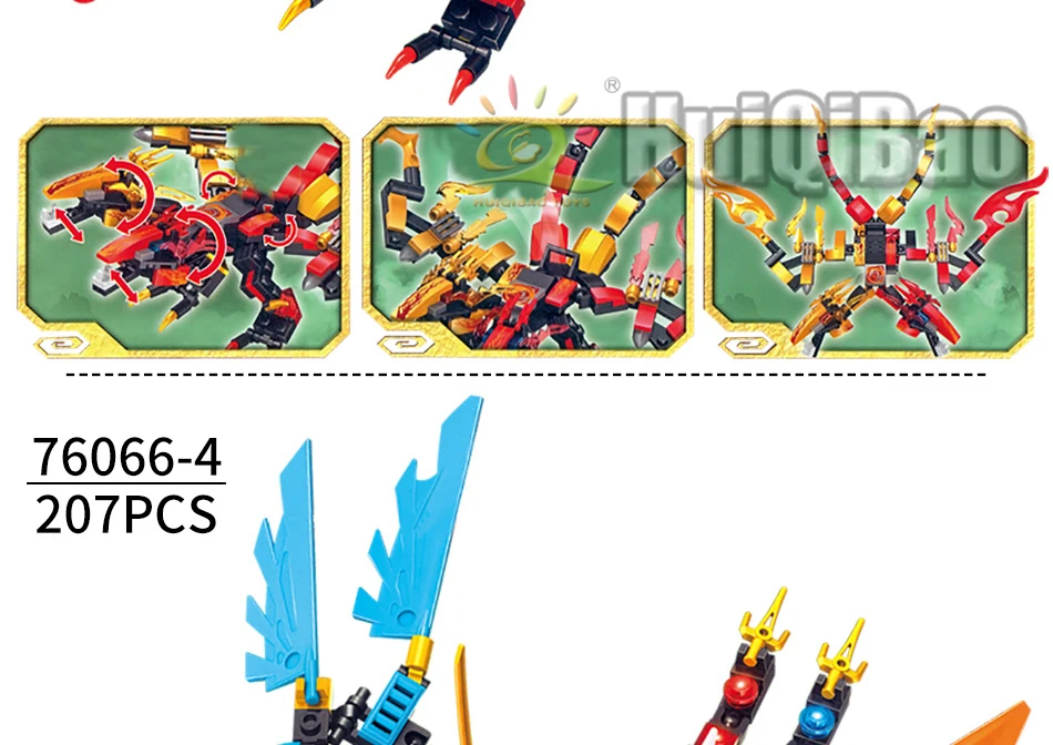 Модель блока: HQB6066 Материал изделия: экологически чистый АБС-пластик Блоки шт: 193 шт/184 шт/207 шт/186 шт Метод сборки: как показано на рисунке Содержание упаковки: 1 Набор строительных блоков dragon knight и подробные инструкции