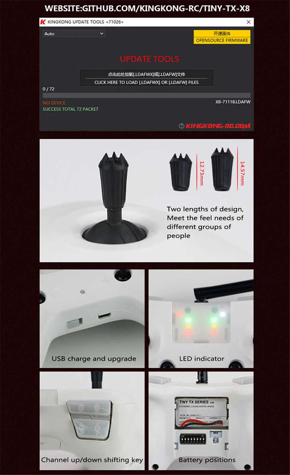 Технические характеристики: Название: цифровое радио TINY X8 Канал: 8CH Тип модели: многомоторный двигатель Частотный диапазон: 2403-2447 МГц 2,4 ГГц Системы: CC2500 & CC2592 Батарея: 3,7 V съемный литий-полимерный Батарея Системы: S-FHSS Название: цифровой ресивер с функцией «RX800-Pro» Канал: 8ch Частотный диапазон: 2403-2447 МГц 2,4 ГГц Системы: CC2500 & CC2592 Выход: S.BUS Вход: 5 В Системы: S-FHSS Упаковочный лист: 1 шт., цифровое радио KINGKONG TINY X8 1 шт * RX800-PRO цифровой приемник (Радиопередатчик X8 был остановлен для производства, мы отправим вам радиопередатчик X8M для u.) Параметры:
