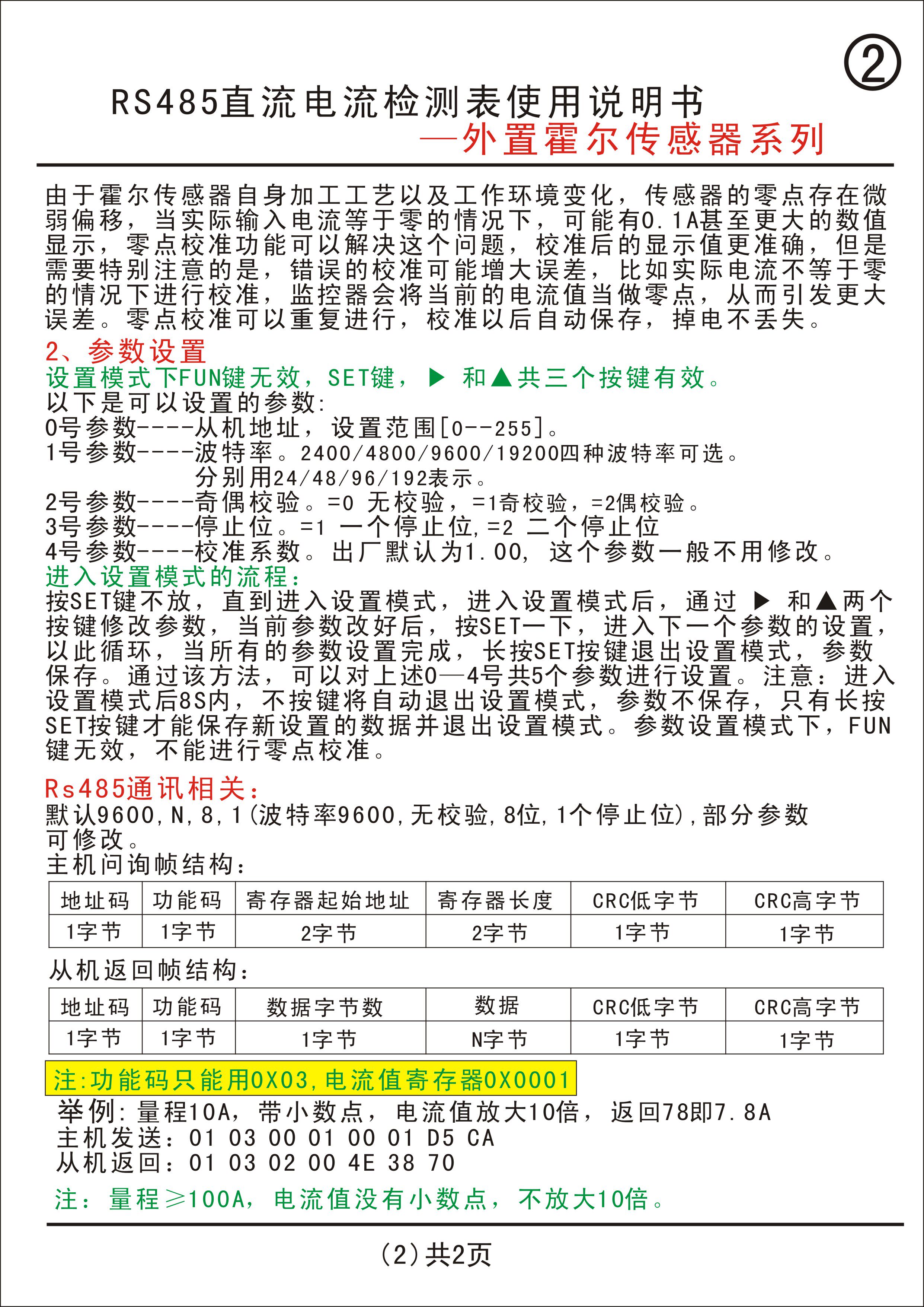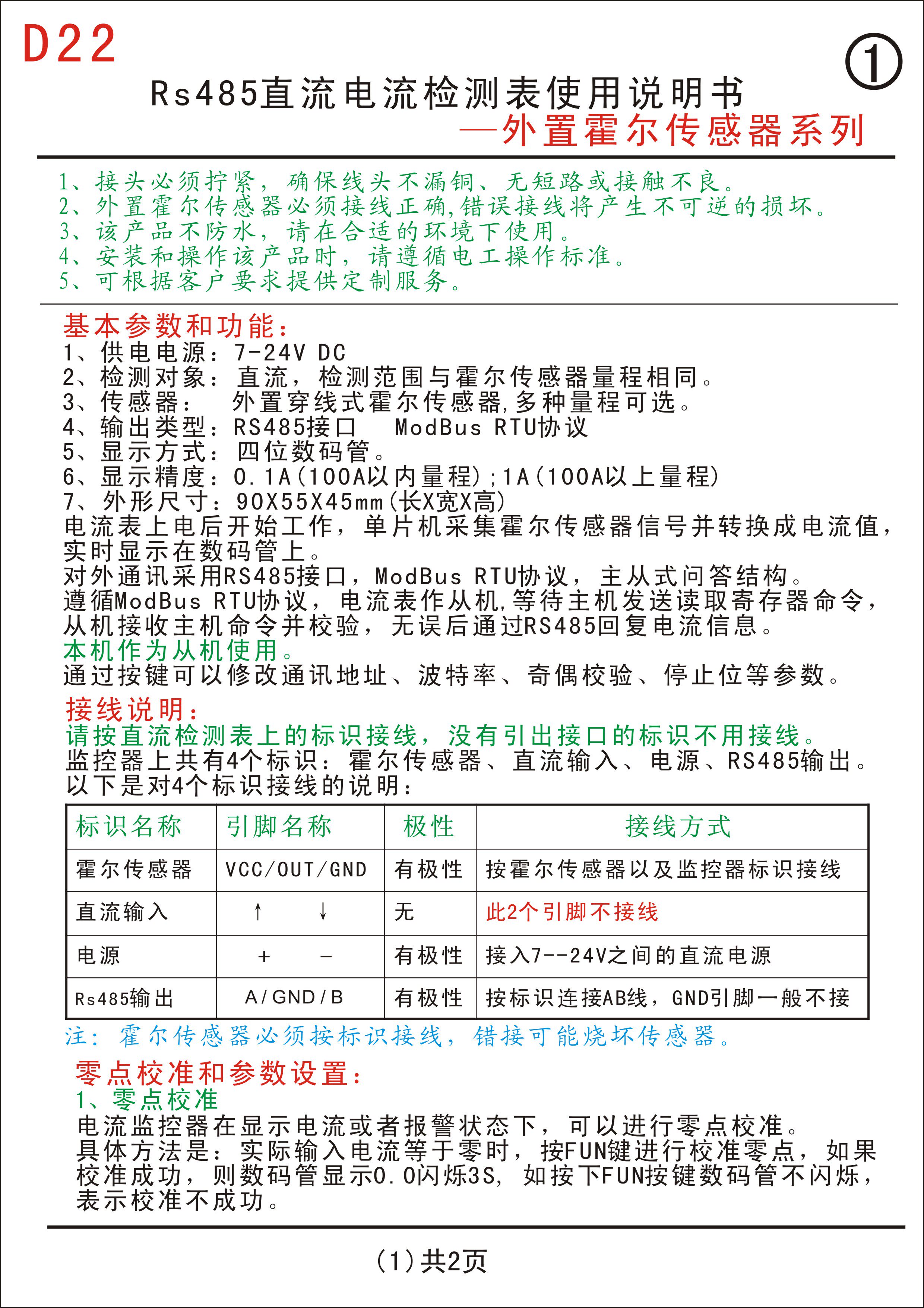 Product model: XJ-D22 Detection object: DC current. Range: 5A/6A/10A/20A/50A/100A/200A/300A/400A/500A/600A optional Sensor: Holzer is sampled by wire isolation and has a pincers optional. Mode of communication: RS485 Communication protocol: ModBus RTU protocol, this module is slave. In the MODBUS RTU protocol, the command code uses 0X03, and the current register reads the address 0X0001.