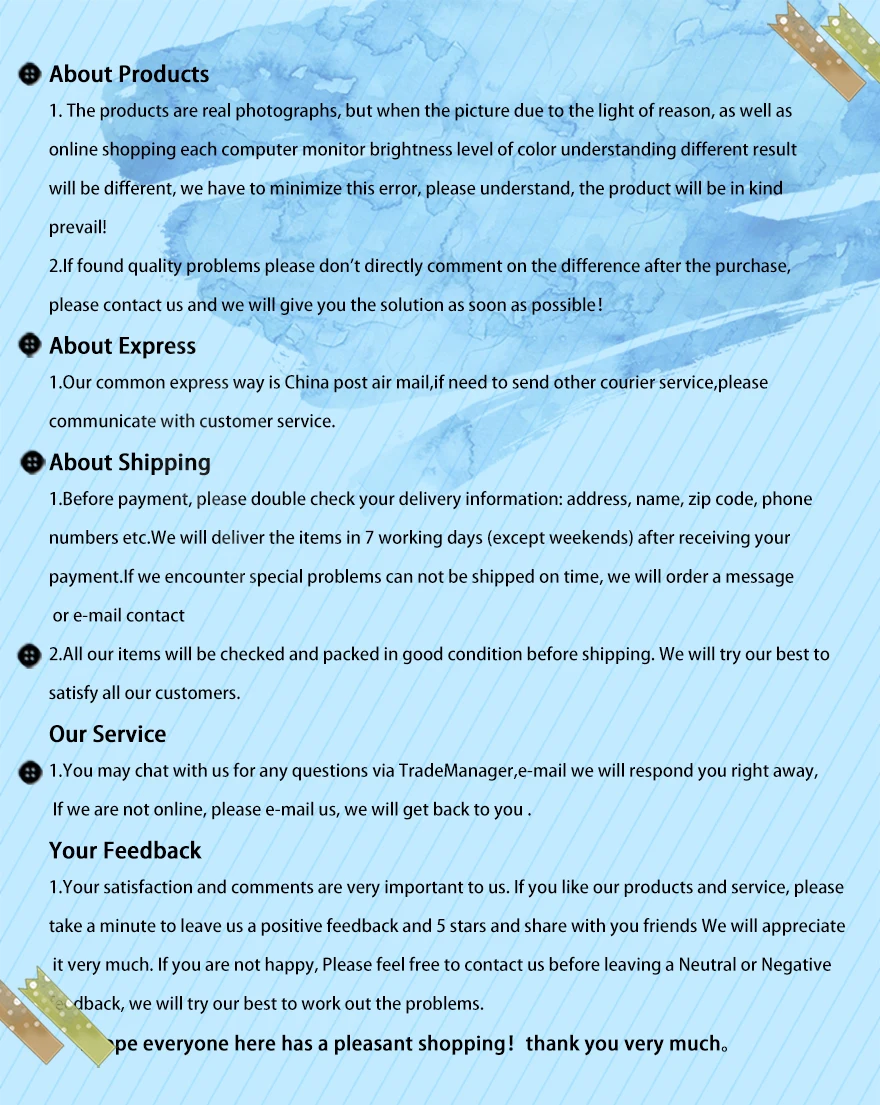 1. Из-за освещения и отображения, небольшая разница в цвете является нормальной, пожалуйста, простите