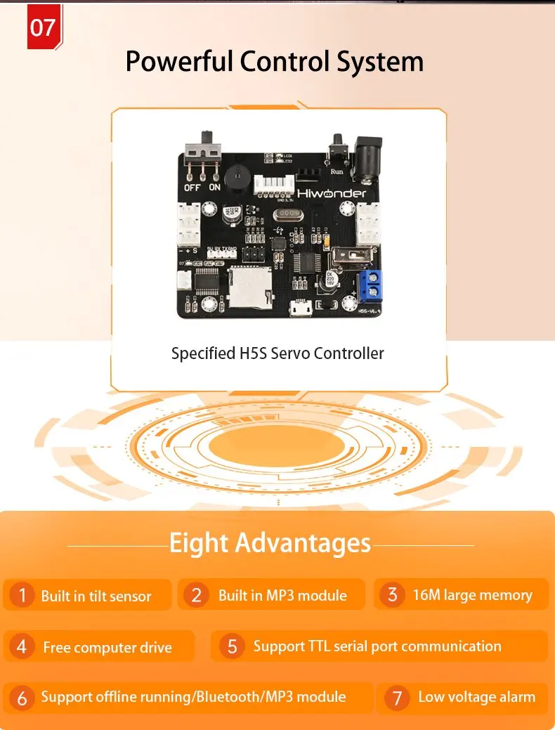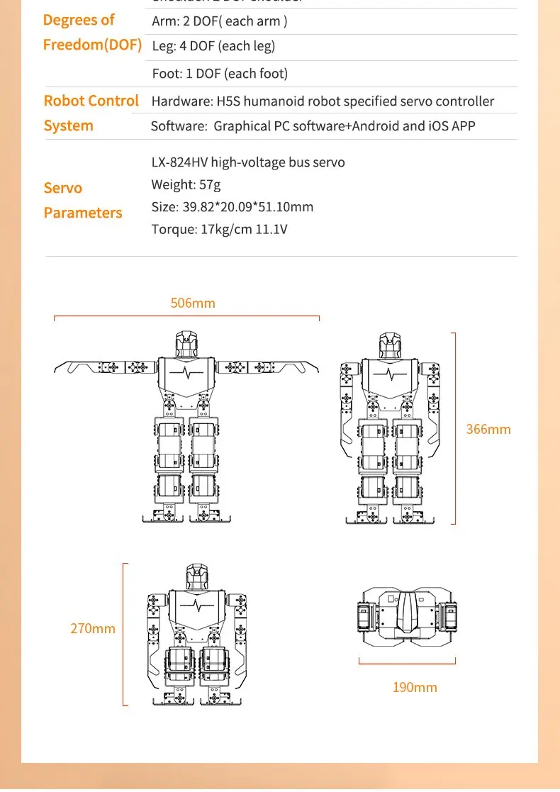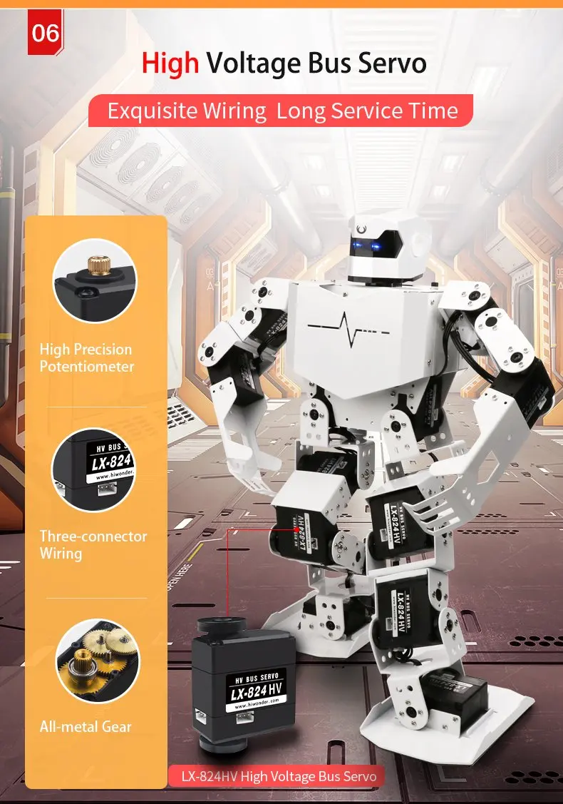Этот робот включает в себя одну головку, одно основное тело, две руки, две ножки, используйте цифровую сервопривод. Этот робот может закончить ходьбу, приседание, поворот, движение бокового скольжения и может танцевать, драться или делать более сложные движения. Если у вас есть соответствующие датчики, вы можете лазить по ступенькам, отслеживать линии и т. Д.