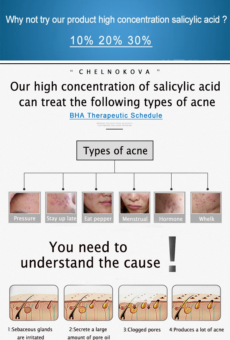 30%: если кутикулы кожи толще, проблема с акне более seriousпожалуйста, используйте 30% салициловую кислоту.