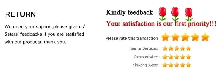 Мы будем работать с вами до тех пор, пока вы не будете удовлетворены. Мы искренне надеемся, что вы можете оставить нам положительные отзывы, по какой-либо причине вы не удовлетворены своей покупкой, пожалуйста, свяжитесь с нами через (мои сообщения) или (задавайте вопросы продавца), торговый менеджер, прежде чем оставлять нейтральные или негативные отзывы. Мы сделаем все возможное, чтобы решить любую проблему и удовлетворить ваши потребности.