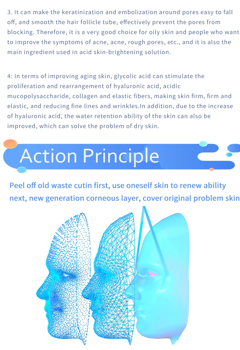 5: с точки зрения улучшения старения кожи, гликолевая кислота может стимулировать пролиферацию и восстановление гиалуроновой кислоты, кислотной мукополисахариды, коллагена и эластичных волокон, делая кожу упругой, упругой и упругой, И уменьшение тонких линий и морщин. Кроме того, из-за увеличения гиалуроновой кислоты, Способность удерживать воду на коже также может быть улучшена, что может решить проблему сухой кожи.