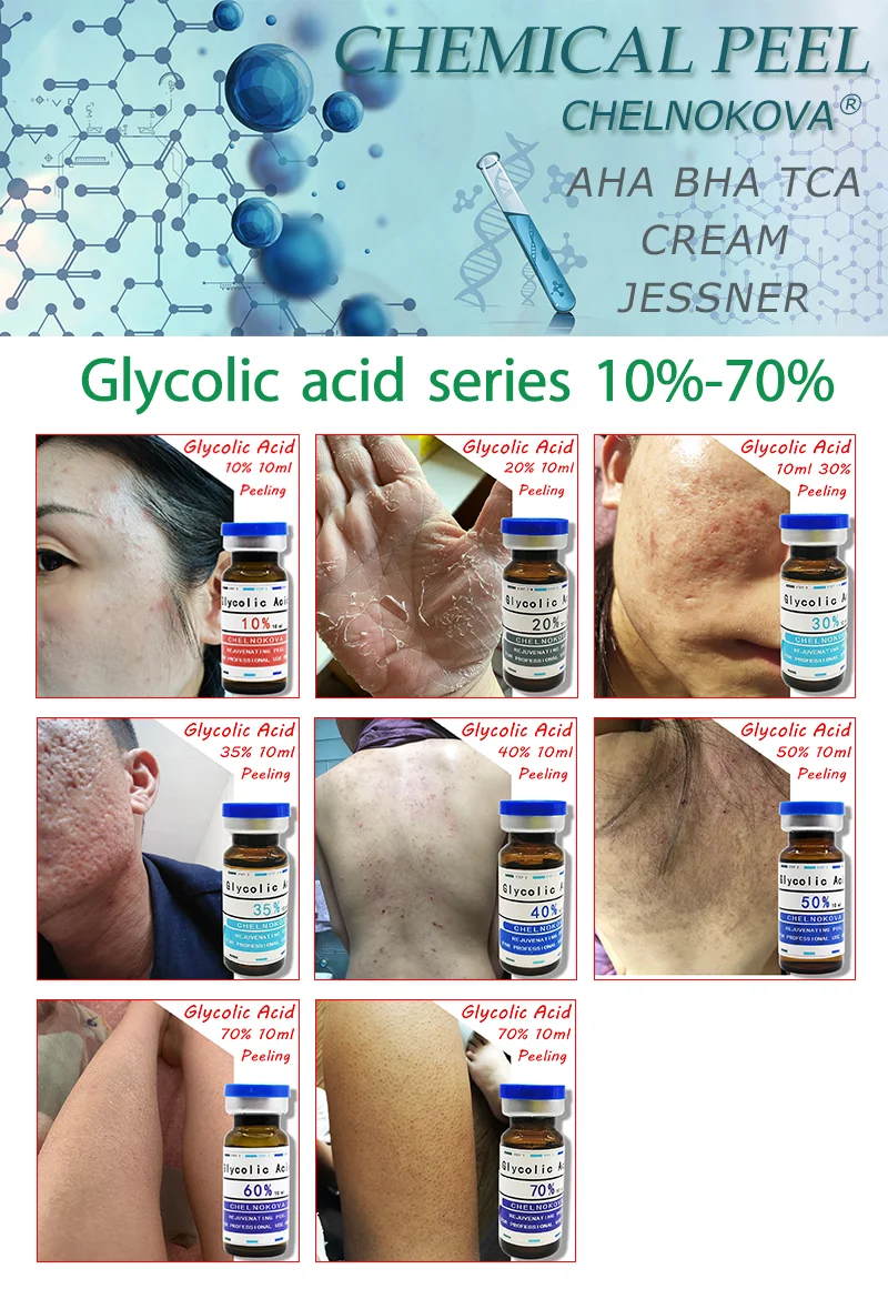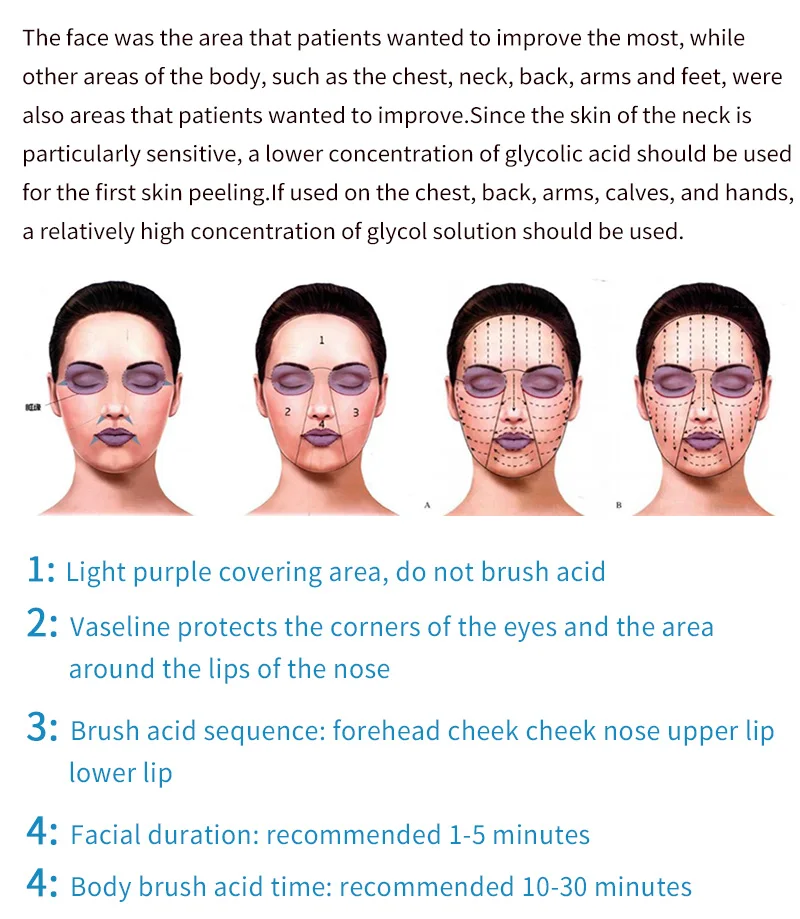 Лицо было областью, в которой больные хотели улучшить больше всего, в то время как другие области тела, такие как грудь, шея, спина, руки и ноги, были также области, в которых больные хотели улучшить. Так как кожа шеи особенно чувствительна, Для первого пилинга кожи следует использовать более низкую концентрацию гликолевой кислоты. При использовании на груди, спине, руках, икр и руках следует использовать раствор Гликоля с относительно высокой концентрацией.