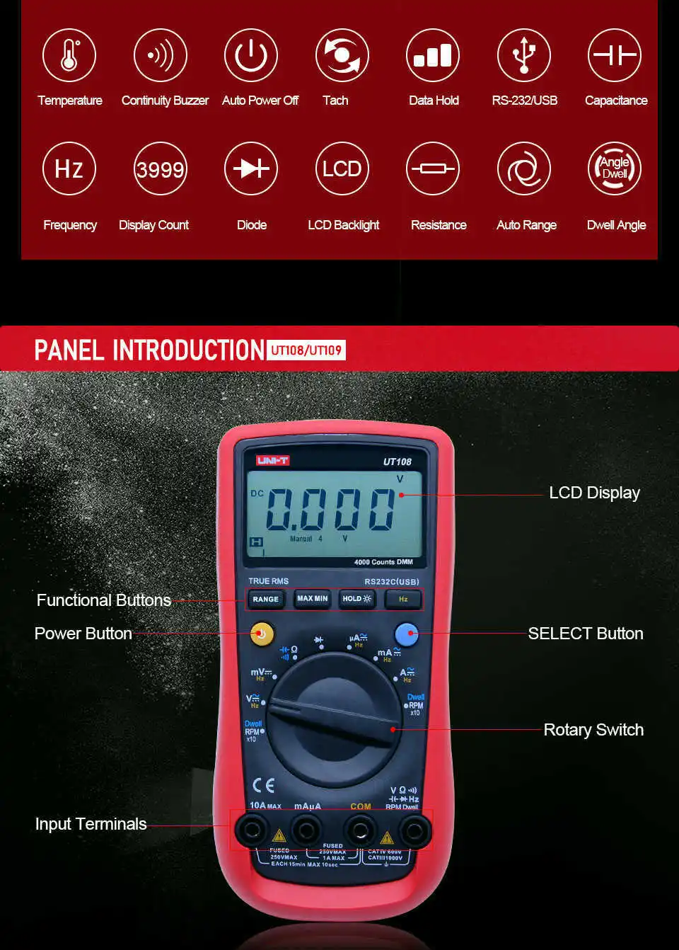 Модель автомобильного цифрового мультиметра. UT108/UT1O9 (далее-«счетчик»)-это 4000 единиц, 3-3/4 цифр ручного измерения. Метр usesбольшая шкала интегральной схемы с интегрированным A/D преобразователем в качестве его ядра. L имеет уникальный дизайн с Экстра большим ЖК-дисплеем. Отображение тестовых проводов подключения. Fulll overioad защита и уникальный дизайн внешнего вида. По этой причине. Он образуется как электрический счетчик с более выдающейся производительностью для более безопасной работы, чем другие метры. Jn в дополнение к функции удержания, тач и данных, измеритель может использоваться для проверки напряжения переменного/постоянного тока, переменного/постоянного тока, сопротивления, частоты. Диод, непрерывность. И емкость