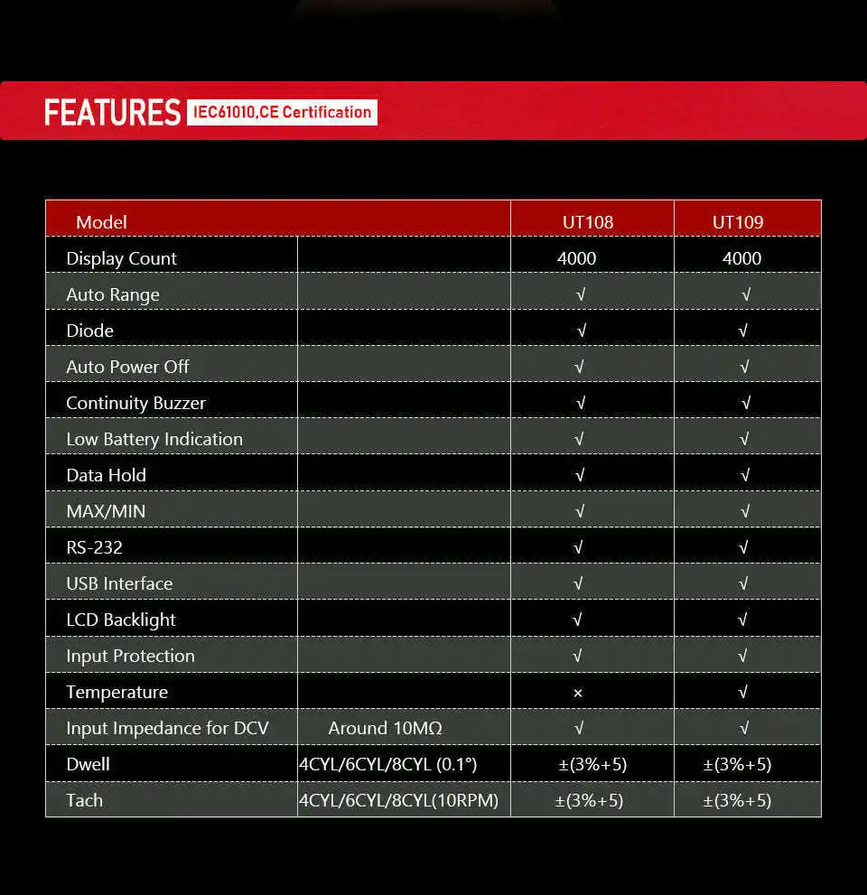 UT 109 имеет дополнительную температурную функцию. (Только UT109 и подходит только для измерения температуры при 230 °C)