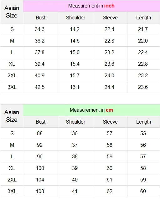 Допускается погрешность ± 2 см для измерения вручную. Азиатский размер меньше, чем Европейский/американский размер. Пожалуйста, проверьте детальные измерения, но не выбирайте по привычке.