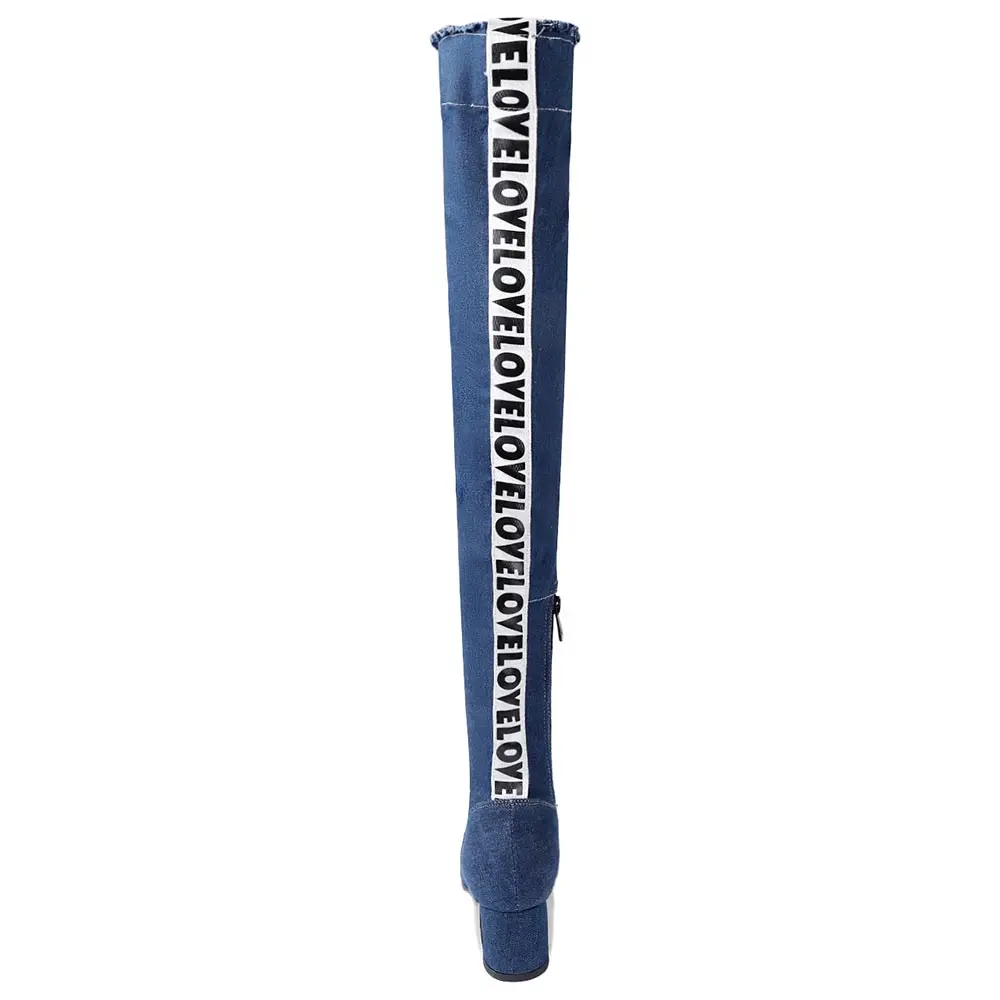 Sgesvier/женские синие джинсовые ботинки выше колена; Ботфорты до бедра; 2018; Женская обувь на высоком толстом каблуке; Джинсовые ботинки; OX490