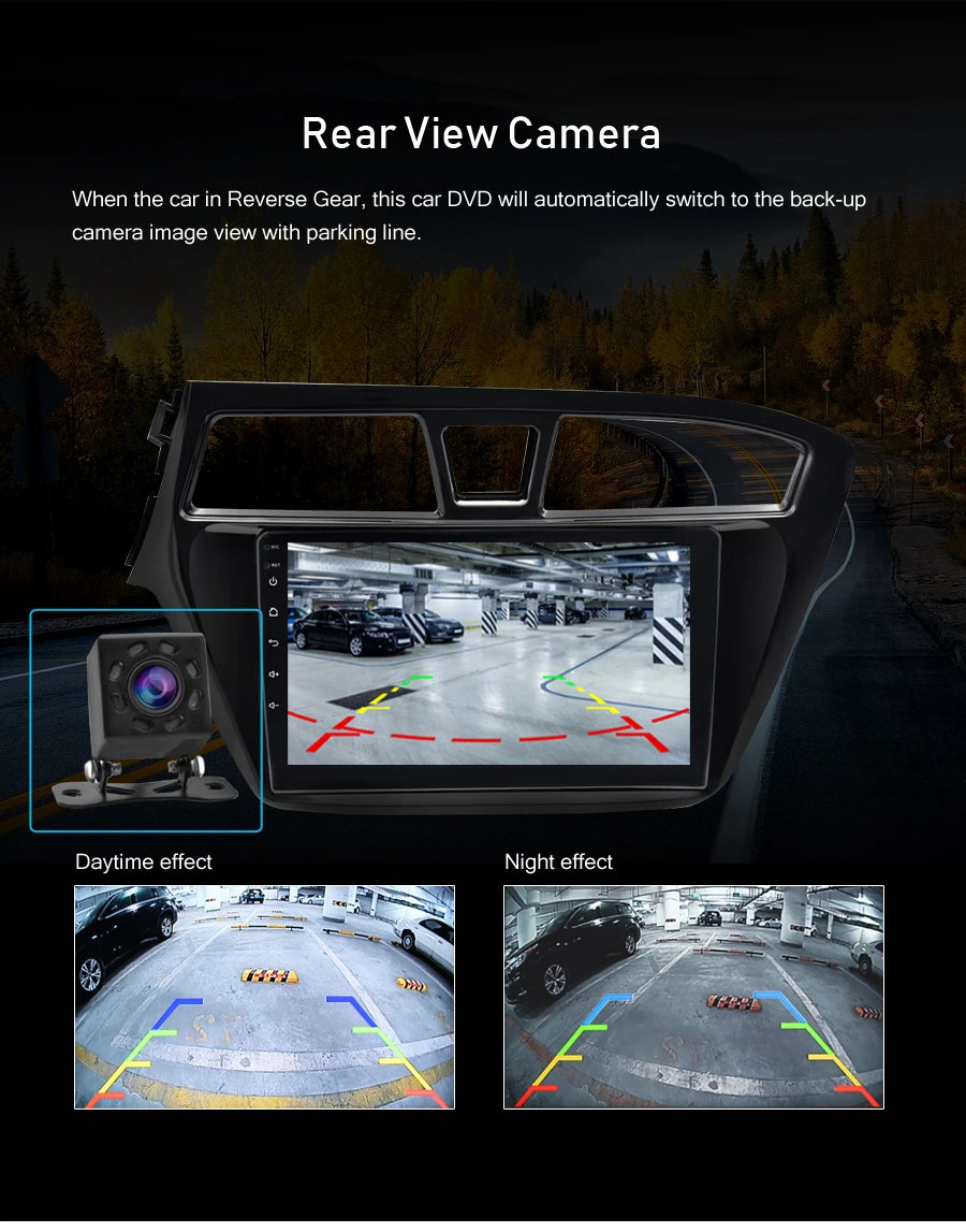 Поддержка входного сигнала камеры заднего вида RCA av-разъема, автоматическое переключение на изображение парковки, когда механизм обратного хода включен.