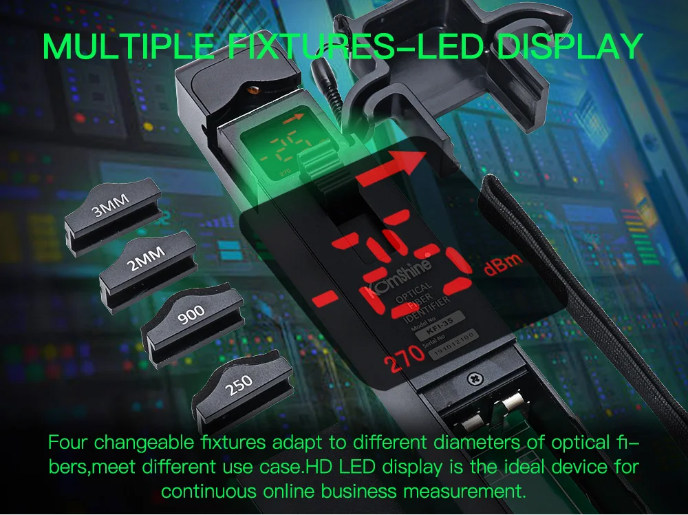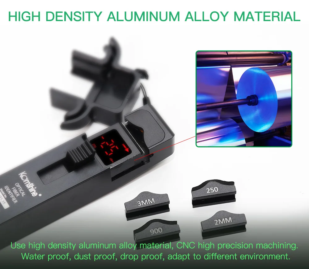 KFI-35 KomShineВолоконно-оптический идентификатор может быстро определить направление передаваемого волокна и отображать относительную мощность ядра без каких-либо повреждений гнутого волокна. Когда трафик присутствует, периодически включается звуковой сигнал.