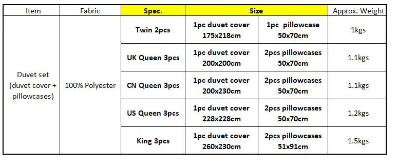 Товар: набор пододеяльников Ткань: 100% полиэстер Технология: эко-печать Посылка включает: 1 пододеяльник + 1 или 2 наволочки, без наполнителя, без простыни Обратите внимание: 1. Допускается разница в цвете: из-за различий мониторов на дисплее возможна разница в цвете между изображениями и товарами, которые вы получили. 2. Допускается разница в размере: усадка при стирке составляет 5%; Разница в размере +/-3 см. 3. Все размеры указаны здесь для справки. Существуют различия в измерениях между различными странами и регионами. Перед подтверждением заказа, пожалуйста, проверьте размер вашей кровати и Размер одеяла и выберите подходящий пододеяльник в соответствии с вашим размером кровати и одеяла.