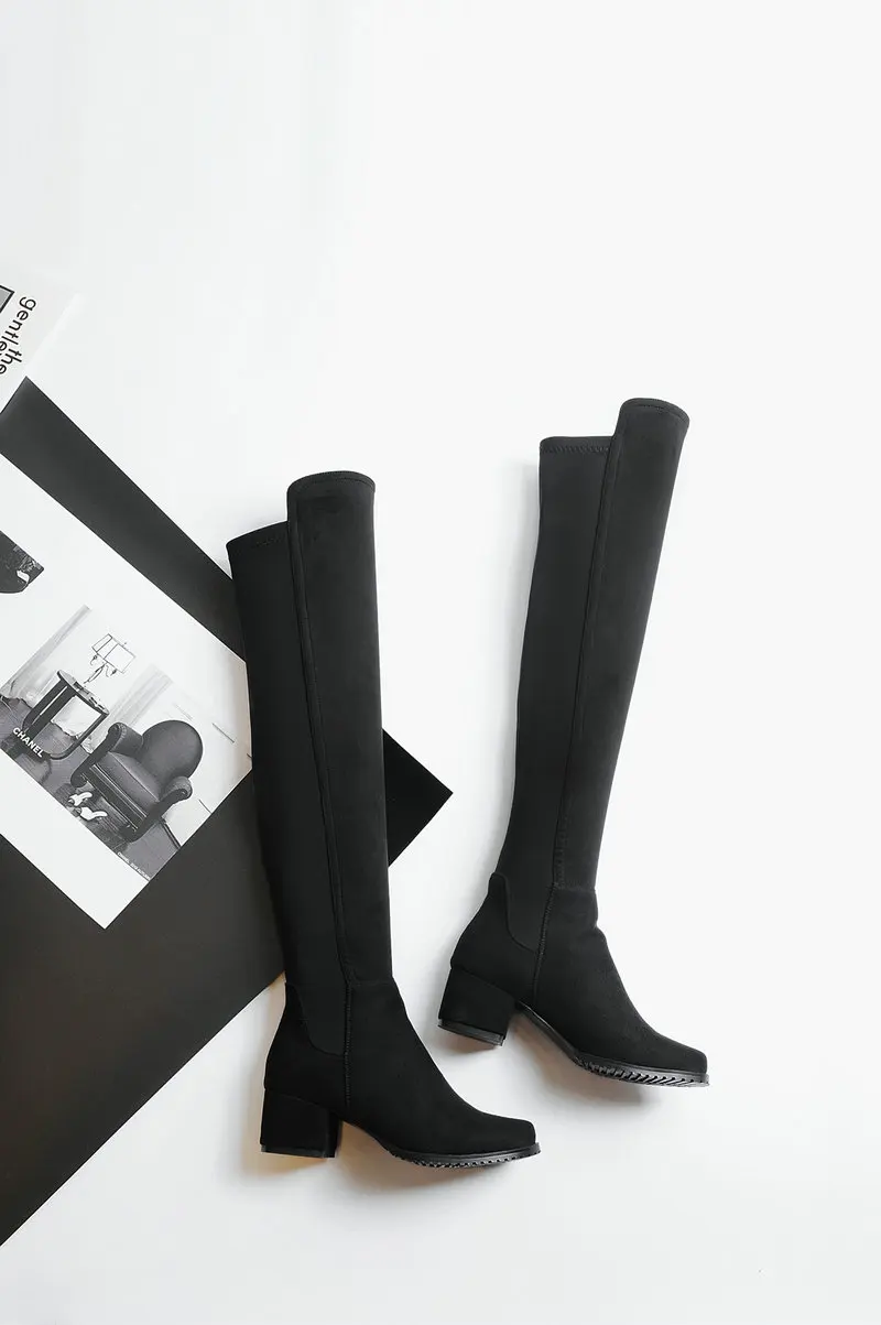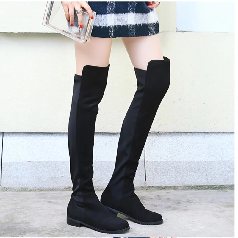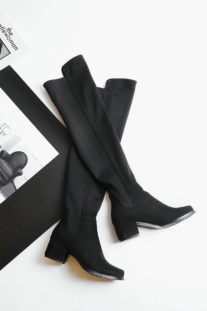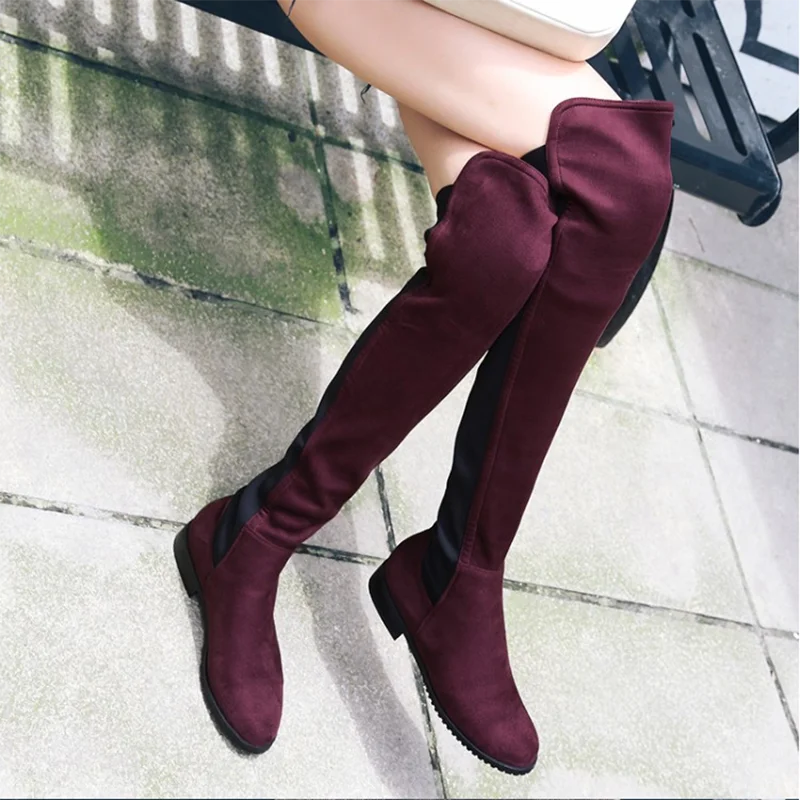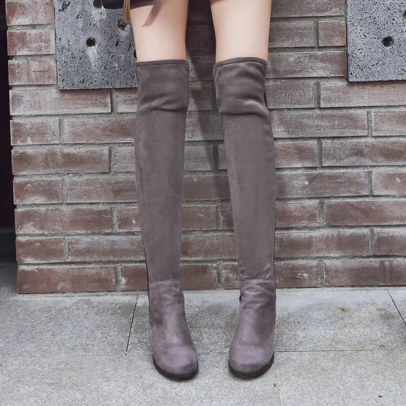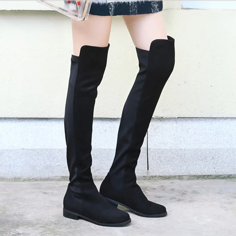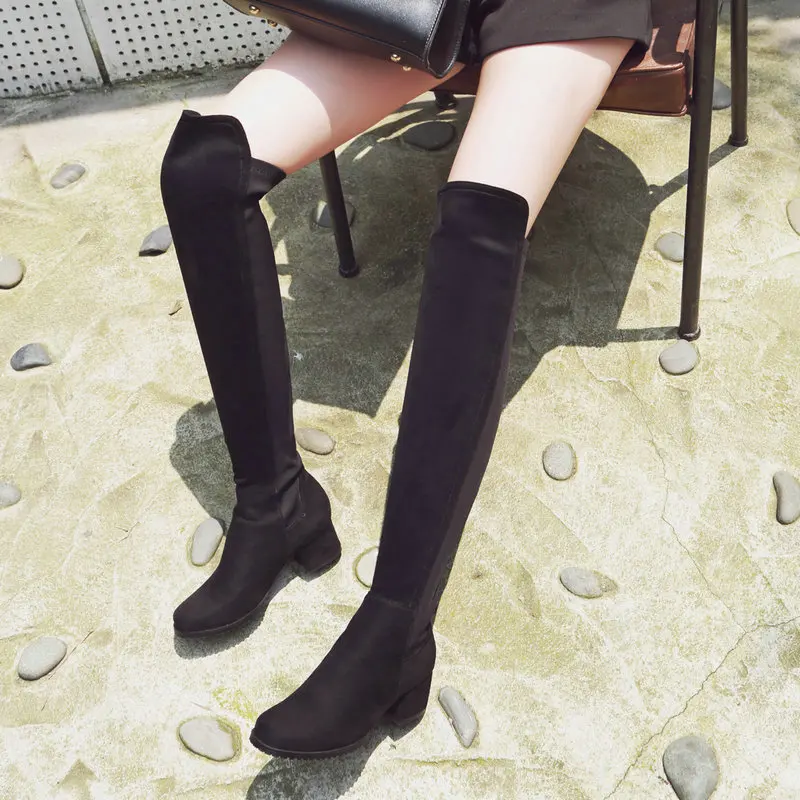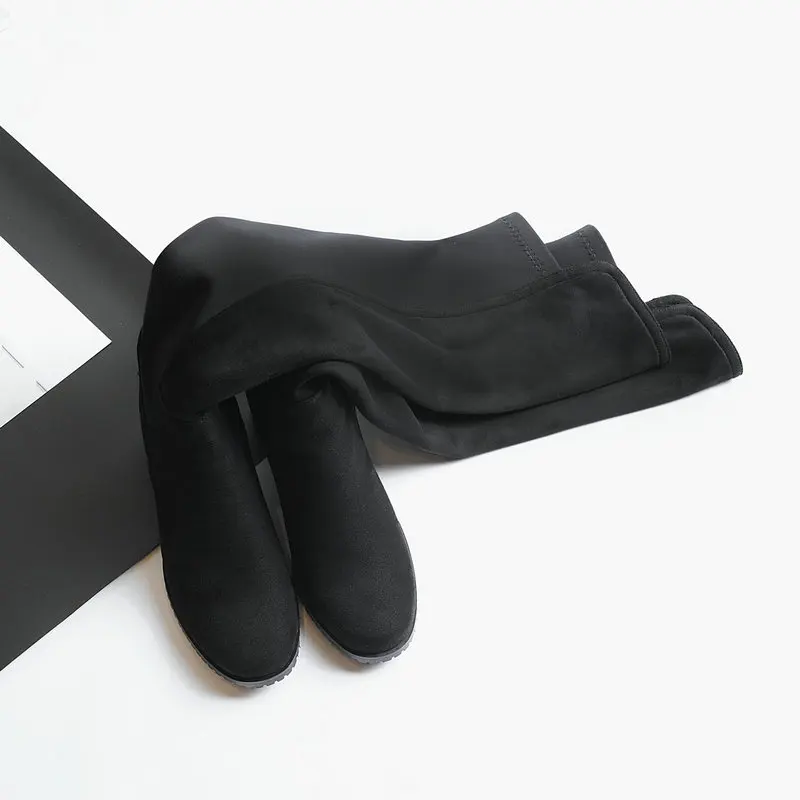 Сапоги выше колена на низком каблуке; Женские модные эластичные сапоги из искусственного флока